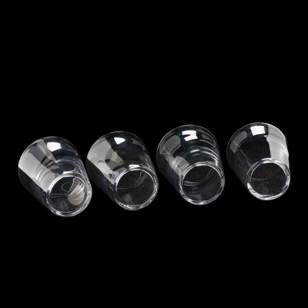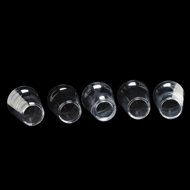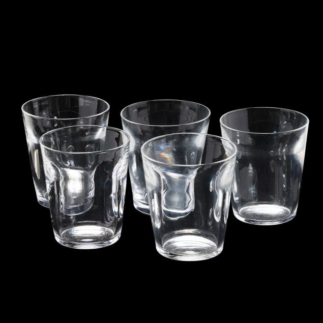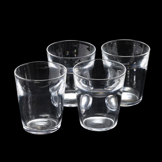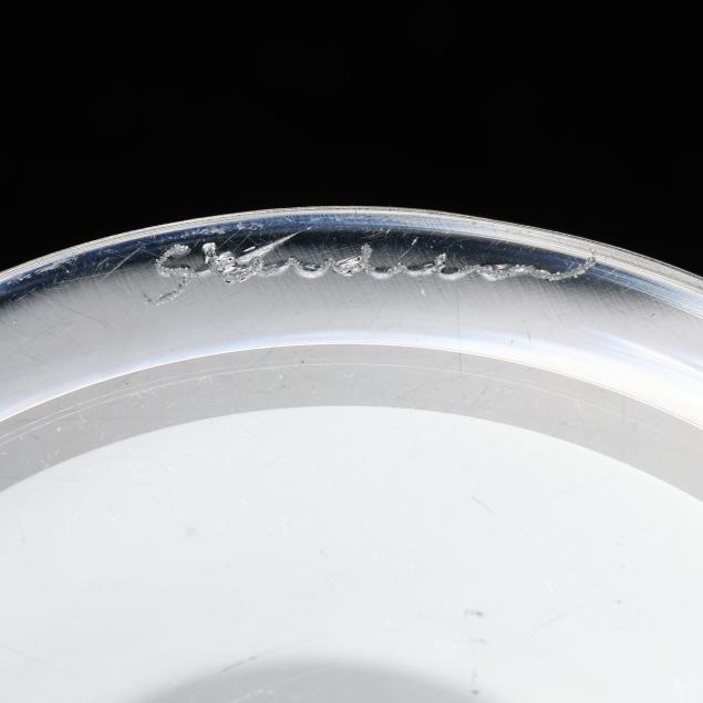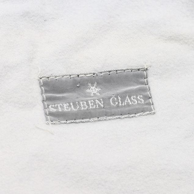 Designed by Frederick Carder in 1932, shape 7711, these being a later production by Steuben, the unique form going from a thin rim to thick body, signed.