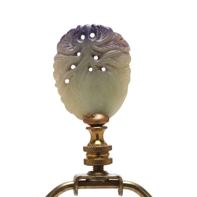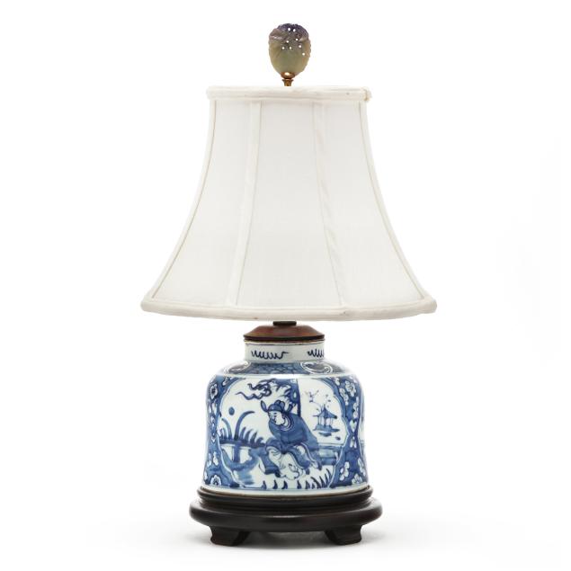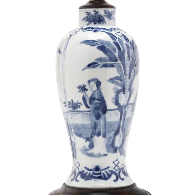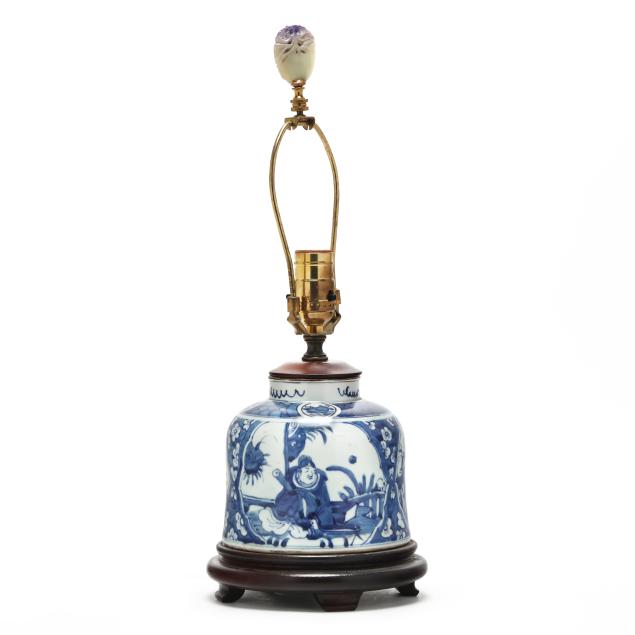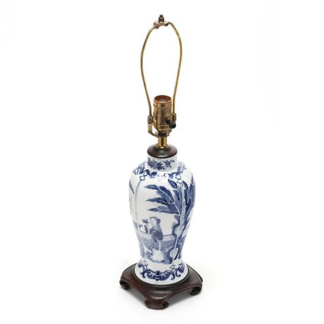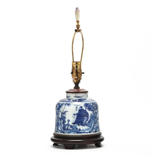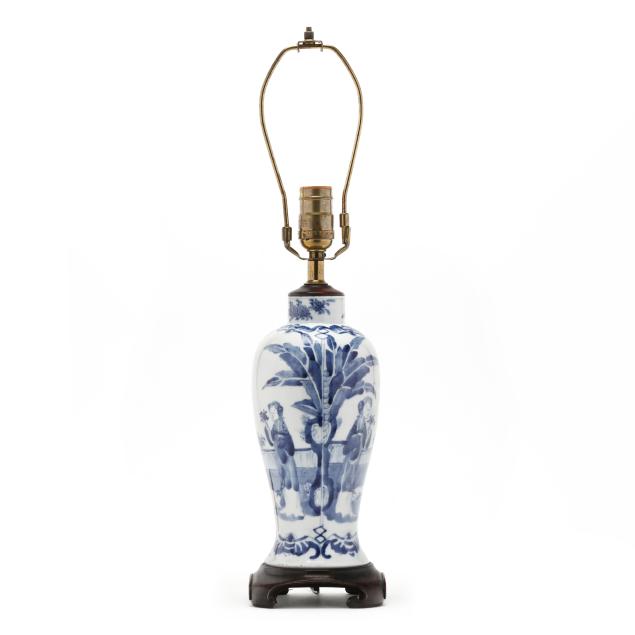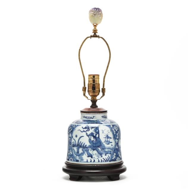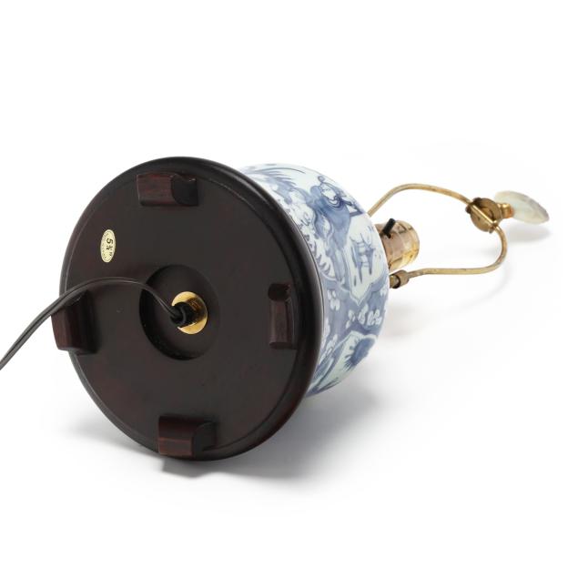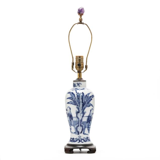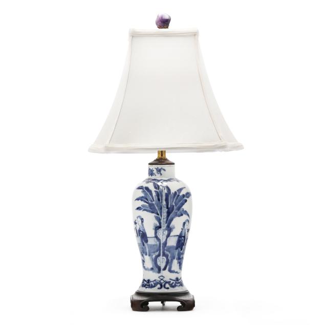 Late Qing dynasty and Republic period, includes a porcelain vase hand-painted in underglaze blue with elegant ladies under banana trees, a border of bats above and below, the vase is drilled and set as a lamp with single lightbulb fixture, fitted into a carved wooden base, presented with a silk lampshade and topped with a polished amethyst finial (23 1/2 in., 13 in. diameter, Vase only 10 in.)(Vase drilled and fitted as a lamp; vase not examined outside of the lamp mounts), and a porcelain vase hand-painted in underglaze blue with scholar figures in reserves surrounded by plum blossom ground, the jar is drilled and set as a lamp with single lightbulb fitting; set into a carved wooden base, presented with a silk lampshade and topped with a carved hardstone finial (19 in., 11in. diameter, Jar only 5 1/2 in.)(Jar drilled and fitted as a lamp; jar not examined outside of the lamp mounts).