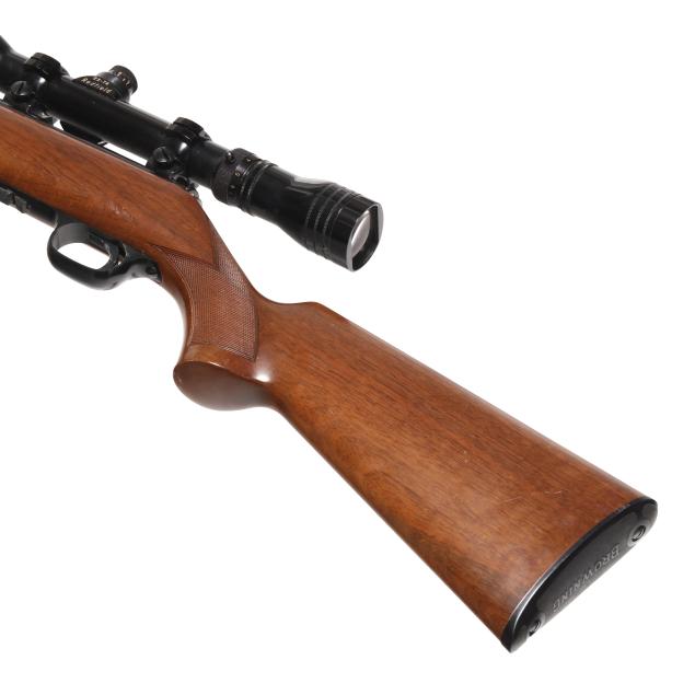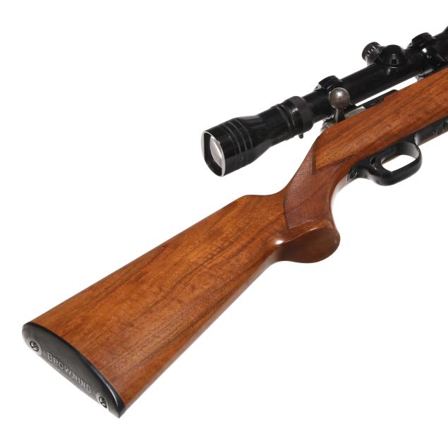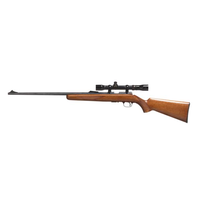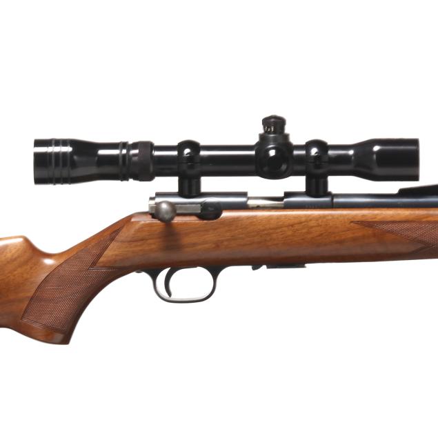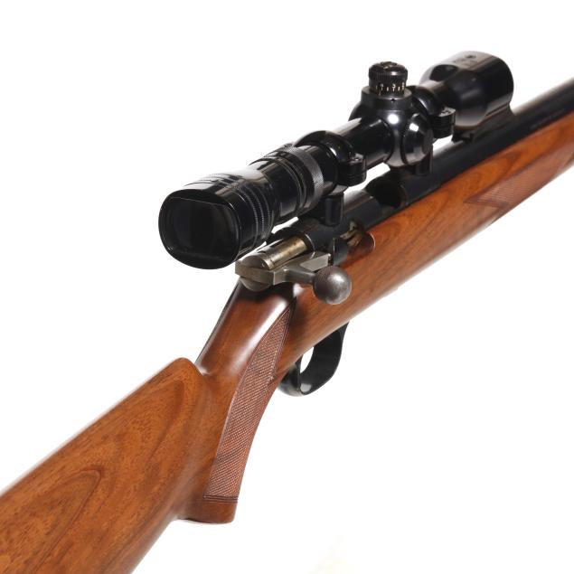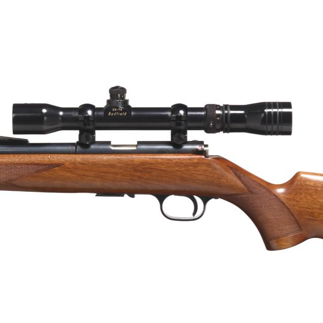 Serial number 68227X present on blued bolt-action receiver, text of T-BOLT .22 LONG RIFLE present on right side of 24 in. blued barrel with screw attached ramped rear sight base and solder attached ramped from sight, manual safety, detachable box magazine, REDFIELD 2X-7X scope, checkered walnut stock with factory buttplate.