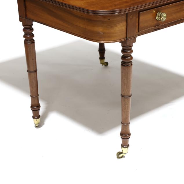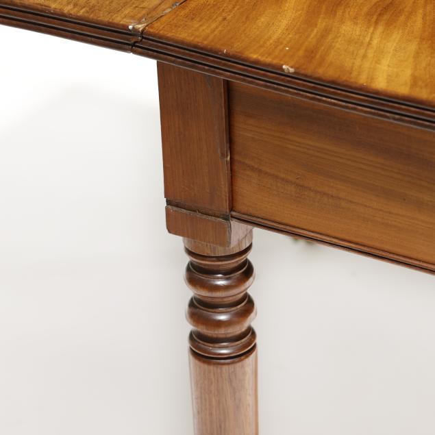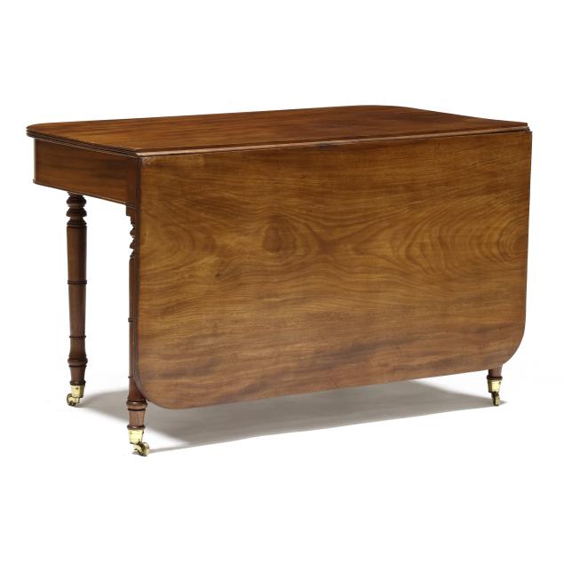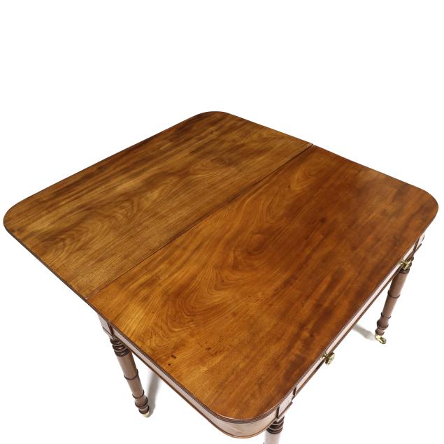 Circa 1800, pine secondary, single board top with reeded edge, deep single drop leaf with double gate-leg supports, single cock beaded drawer, ring turned legs on brass casters.