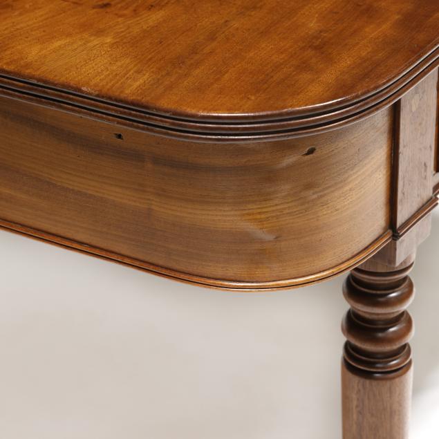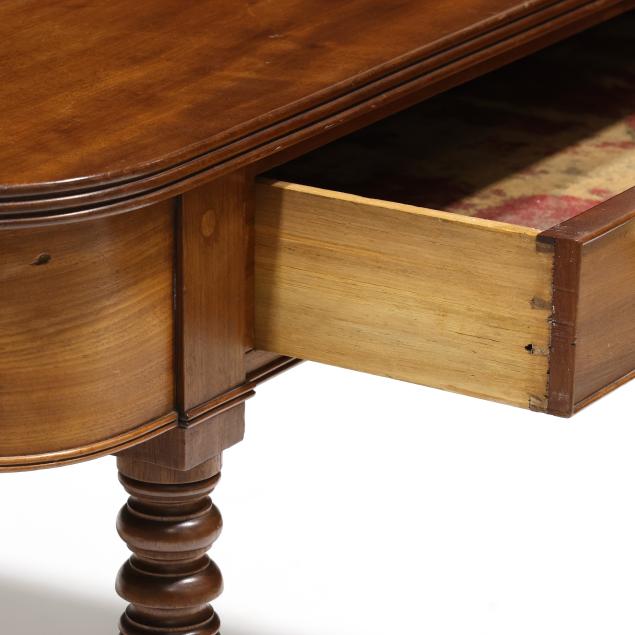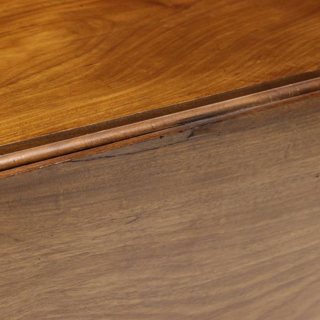 Top with scraping and wear from general use; later pulls and lock with patch to cock beading; front left leg with plug hole (likely from being reset); drawer interior with residue from previous liner being removed.