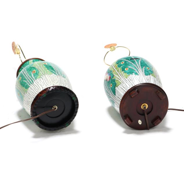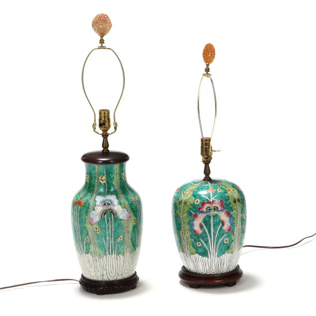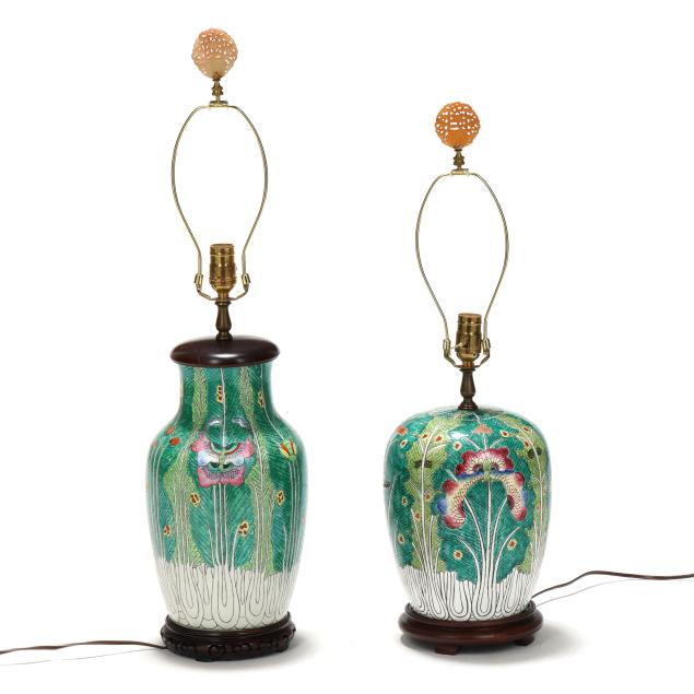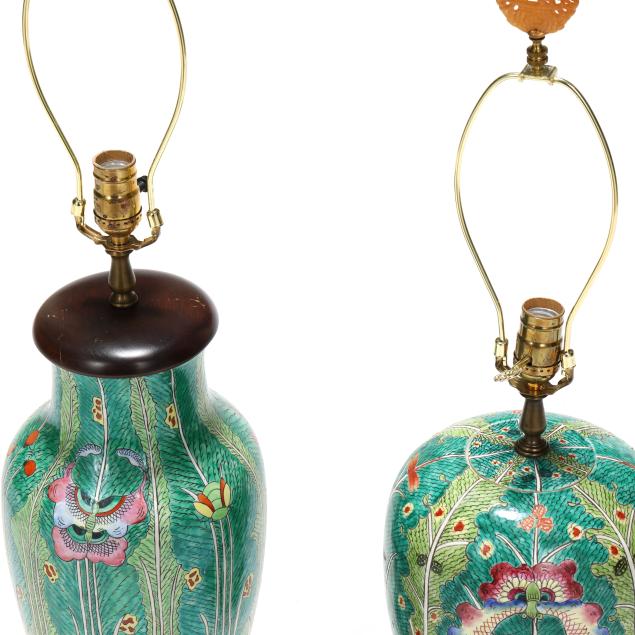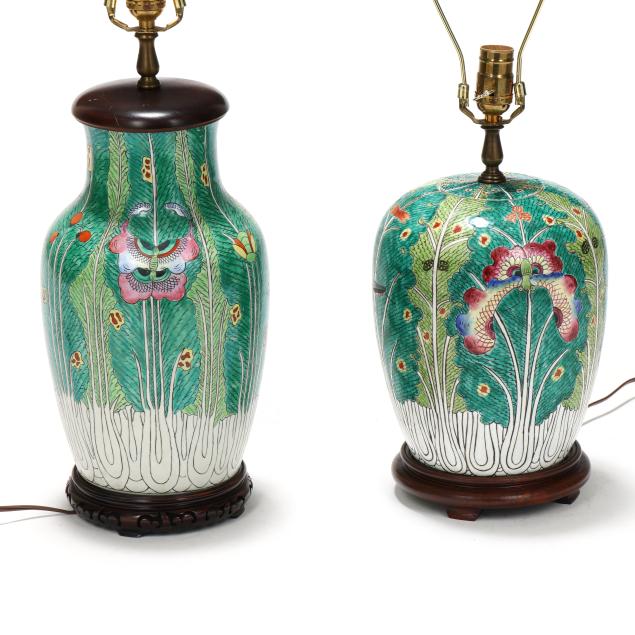 Republic period (1912-1949), includes one vase and one ginger jar with inset cover, both hand painted in the vibrant cabbage leaf pattern with colorful butterflies and insects, the vase and jar are drilled and set as lamps with a single lightbulb fitting to each, fitted in carved wooden bases, presented with silk lampshades, and each with carved circular hardstone finials.