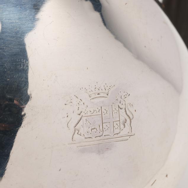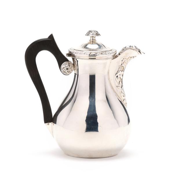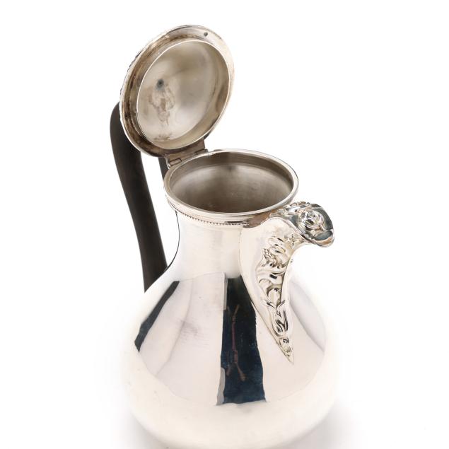 .950 silver, period marks circa 1798-1809 to the underside, Minerva mark in the 1st standard to the shoulder circa 1838 and after, featuring an ebonized handle, a medallion mount and finial, repousse decoration to the lid and spout, and an armorial monogram.