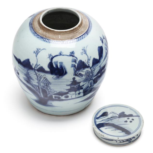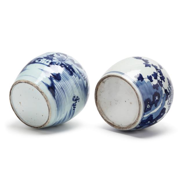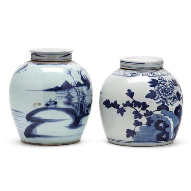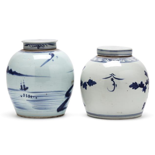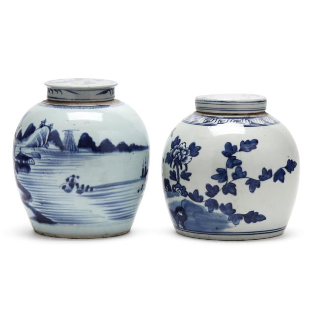 Mid- to late 20th century, porcelain jars hand painted in blue, one with a large chrysanthemum blooms and the other with a scenic seaside landscape, each jar comes together with a decorated porcelain cover.