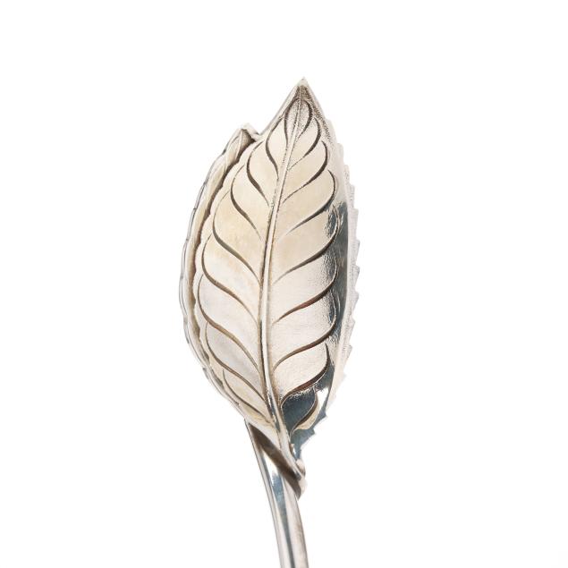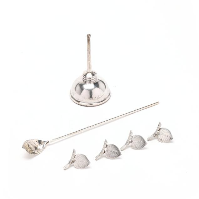 Late 20th century marks; includes a Vermouth dropper, (4 x 2 1/4 in. dia.); a cocktail stirrer and sipper with leaf form bowl (8 3/8 in.); and (4) leaf form place card holders (each 1 in.); the stirrer and place card holders retaining retail boxes; none monogrammed.