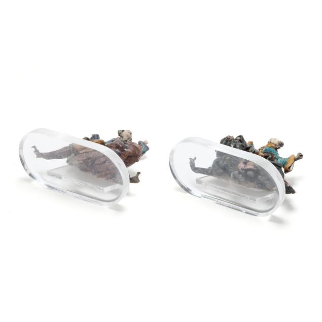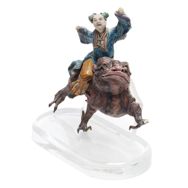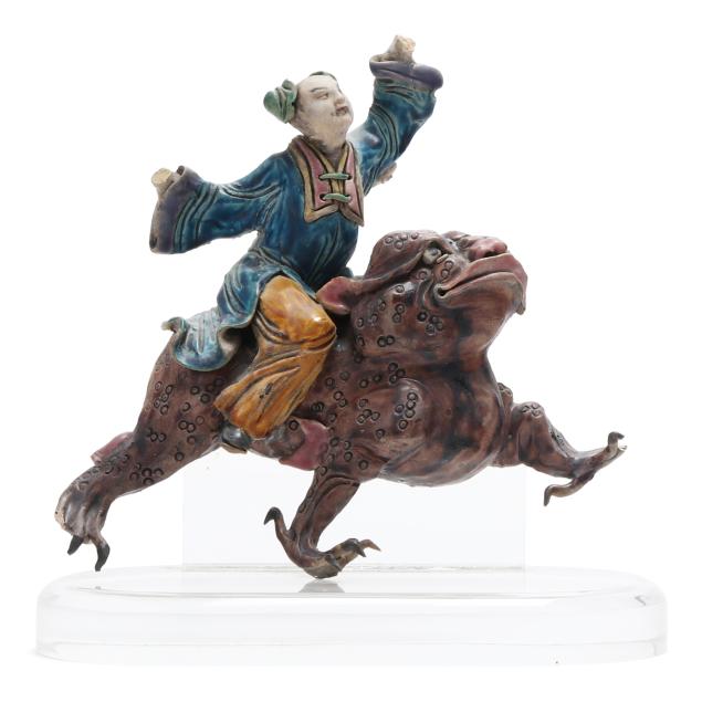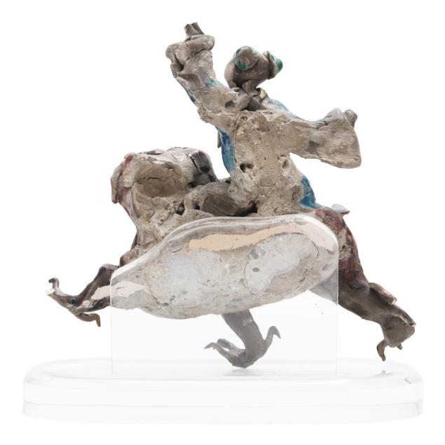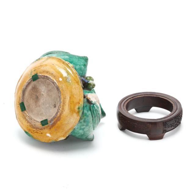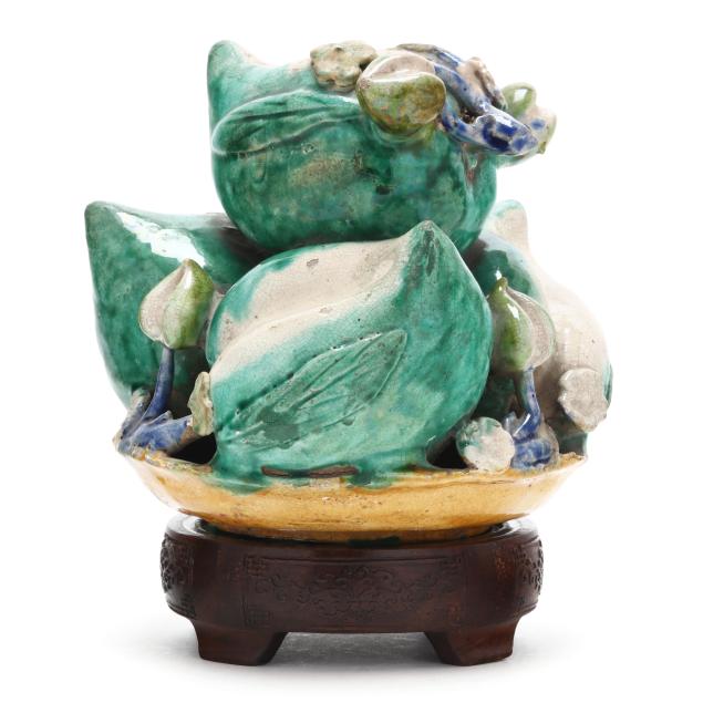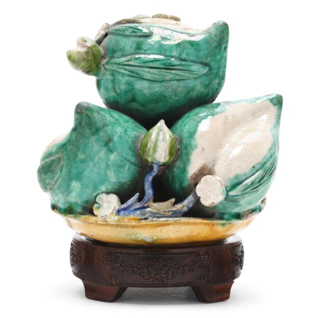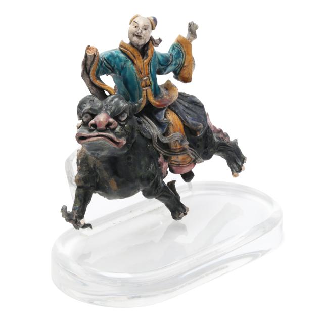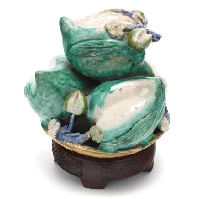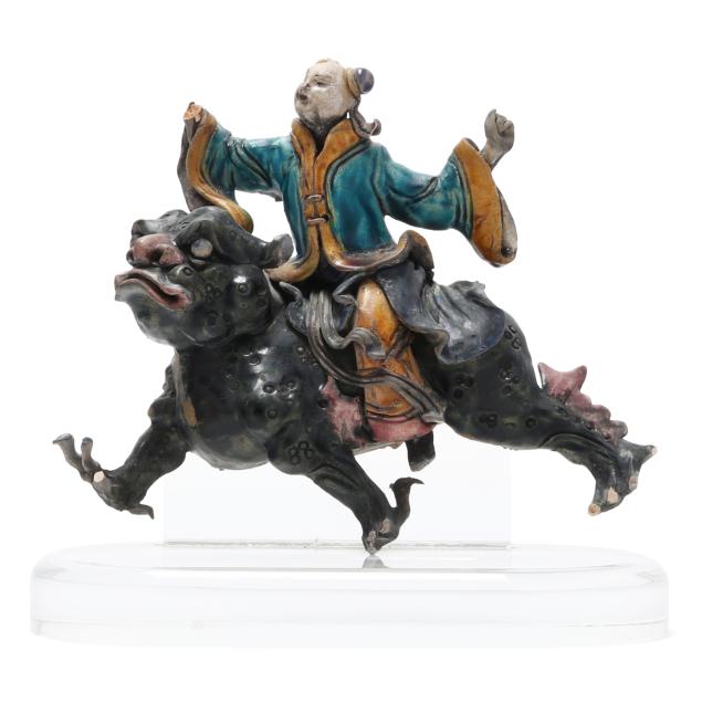 Late 19th century, a pair of Chinese ceramic glazed roof tiles of riders on lions presented on clear acrylic stands (loss to toes on both lions; loss to both hands of one rider, and one hand to the other rider; scattered nicks with loss to both tiles), and a ceramic carved bowl of peaches in green and straw yellow glaze, presented on a wood stand (7 in., 6 1/2 in. diameter)(a few nicks with losses to underside of bowl).