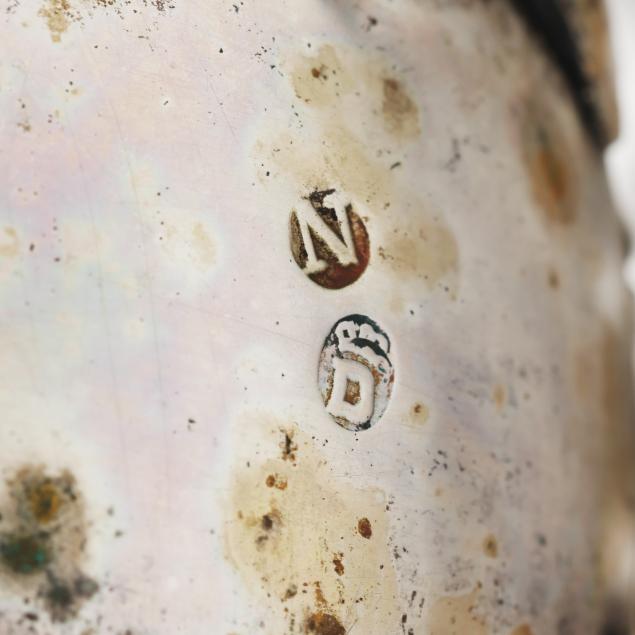 19th century, possibly German, openwork forms with palmette leaves and repousse draped garland, raised on four scrolled feet, not monogrammed.