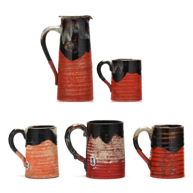20th century, includes a tall pitcher (8 x 5 1/2 x 4 in.) and four mugs (4 1/2 x 5 x 3 1/2 in., 5 x 6 x 4 in., 4 3/4 x 5 x 3 1/2 in., 4 x 4 1/2 x 3 1/4 in.) .