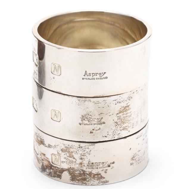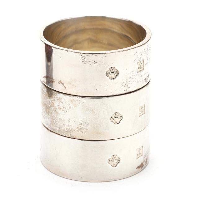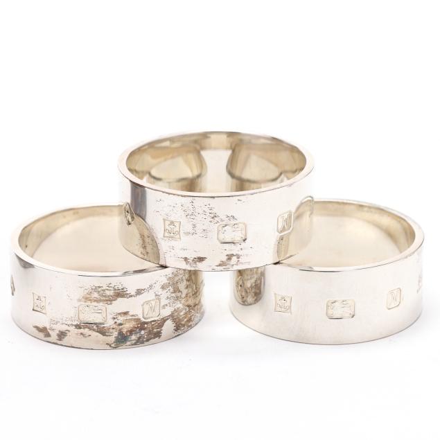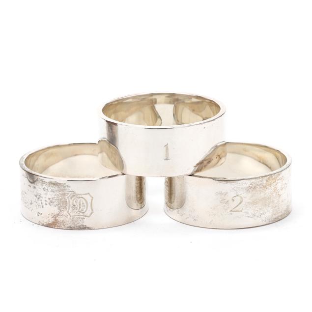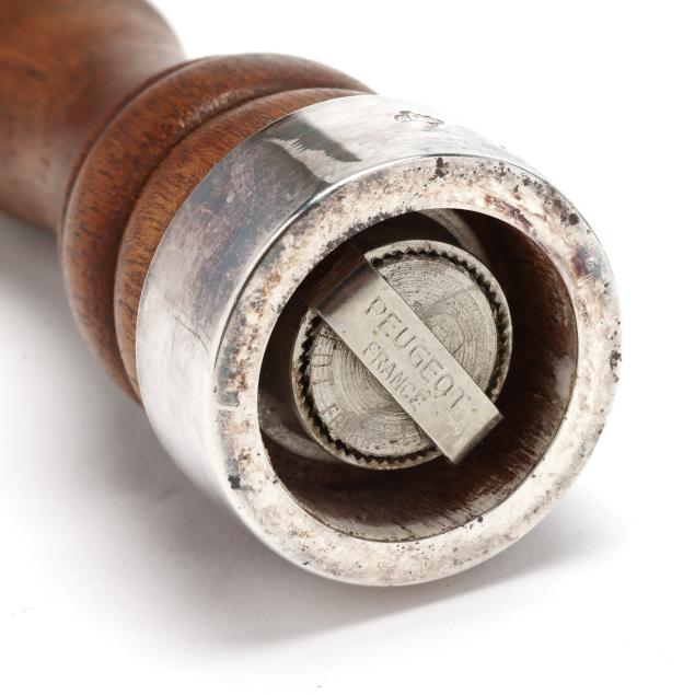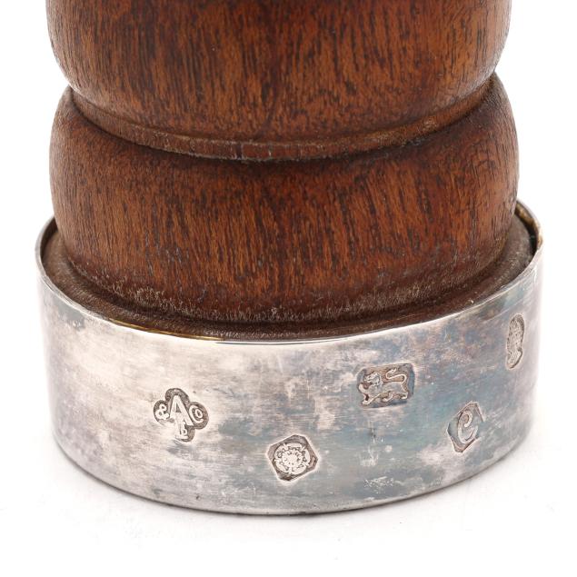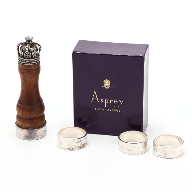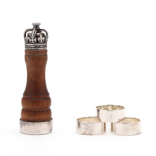 The napkin rings: Birmingham (1962), two are numbered and one features a "D" monogram, retaining original retail box (Each 1 3/4 in. dia. Box dimensions 2 1/4 x 4 1/4 x 5 1/4 in.); and a pepper mill, Sheffield (1977), with a crown form top, not monogrammed (6 1/2 x 1 7/8 in. dia.).