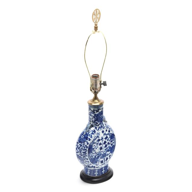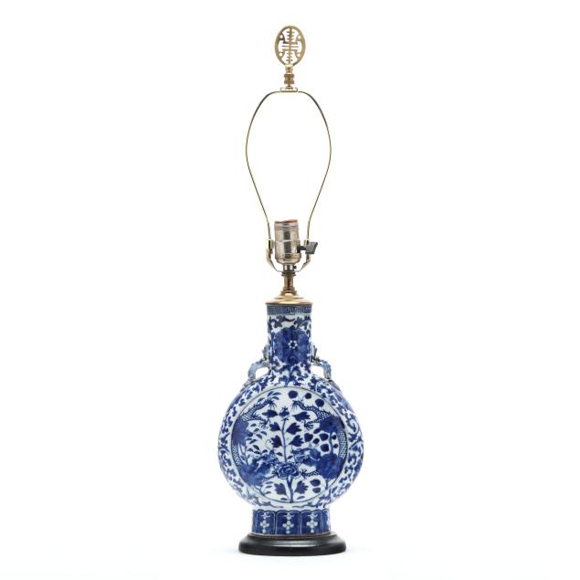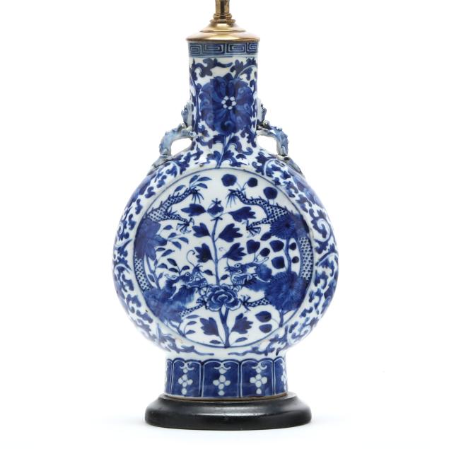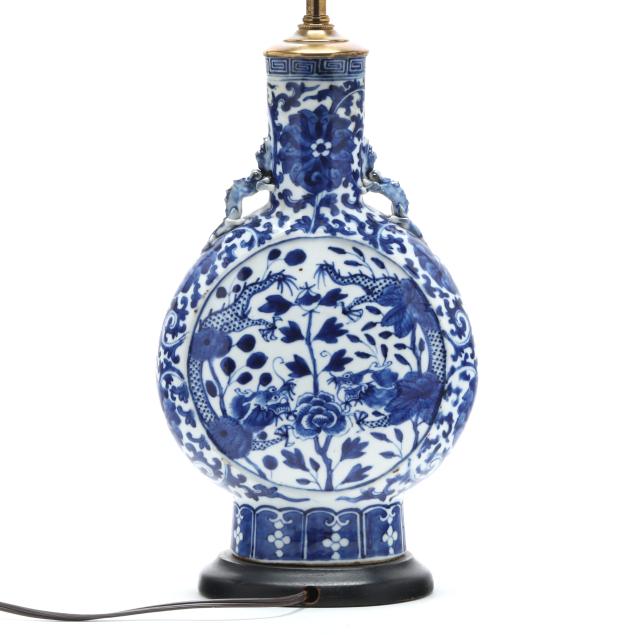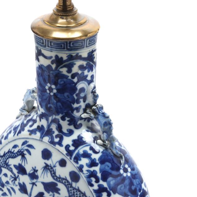 20th century, porcelain moon shaped flask vase decorated in underglaze blue with double dragons to center medallions and surrounded by lotus blossom and scrolling tendril ground, with foo lions in high relief to the shoulders, the vase is drilled and set as a lamp with single lightbulb fixture, fitted into a carved wooden base, with navy fabric lampshade, topped with a brass longevity symbol finial.