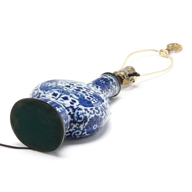 From the Collection of a Lady, Williamsburg, Virginia Good estate condition; break with repair to one foo lion's tail, the other foo lion with a break with loss to his backbone; some nicks to lower edge of circular recession; repair and restoration to neck and rim; jar not examined outside of the lamp mounts; jar drilled an fitted as a lamp; lamp not tested.