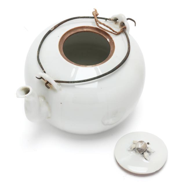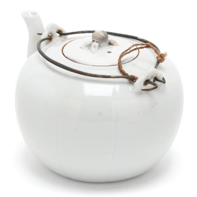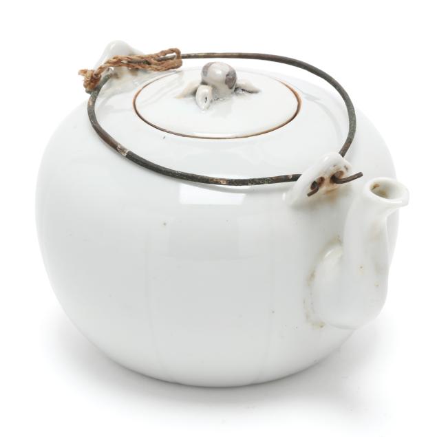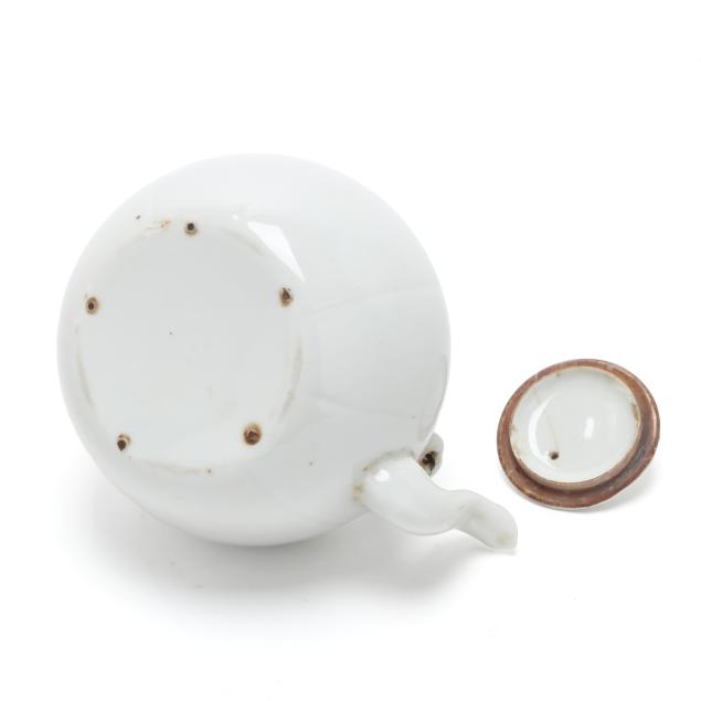 Includes a late 18th century porcelain teapot with fruit finial, five kiln spur marks to the underside, and a late 19th or early 20th century custom carved wood carrying case.