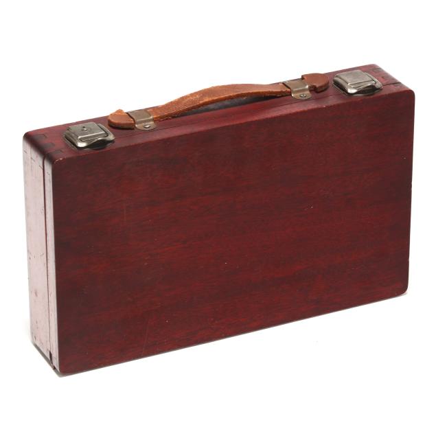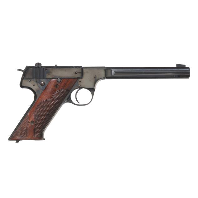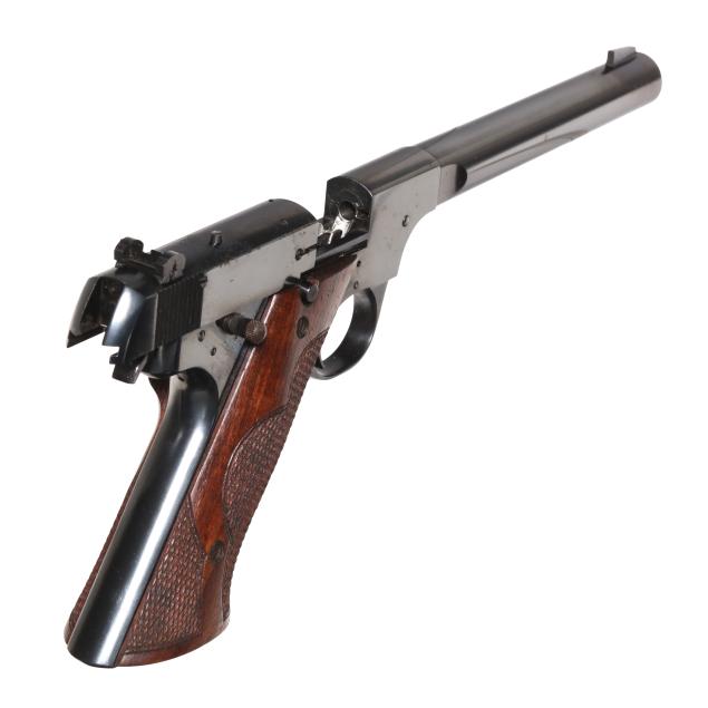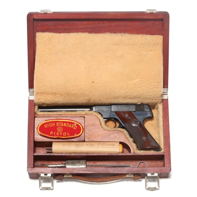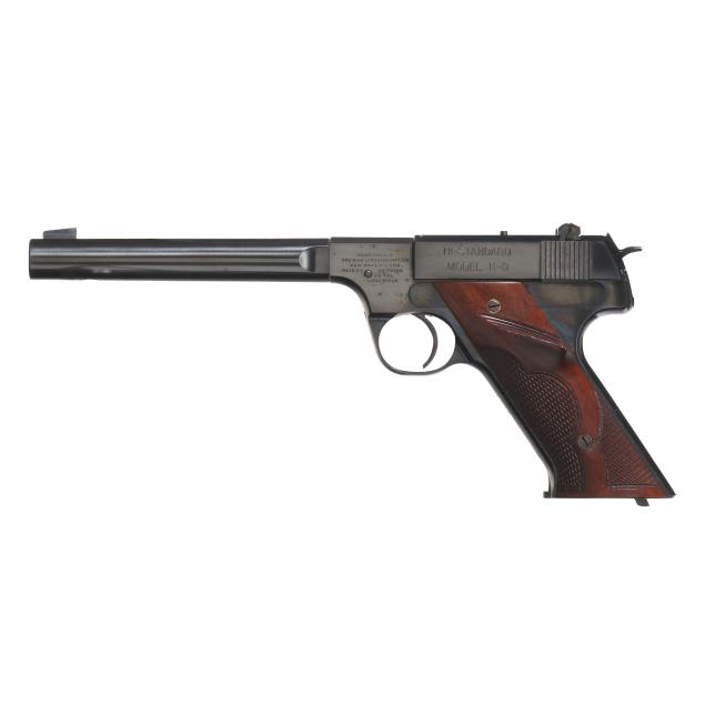 Serial number 82634 present on front strap of blued frame, text of HI-STANDARD MODEL H-D present on left side of slide, 6 3/4 in. blued barrel with blade front sight, adjustable rear sight, single magazine, cocking indicator, checkered walnut target grip scales, factory wood presentation case, oil bottle, tool kit, covered compartment for ammunition, Hi-Standard Pistol fabric patch, cleaning brush and jag.