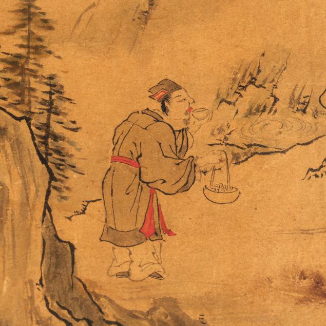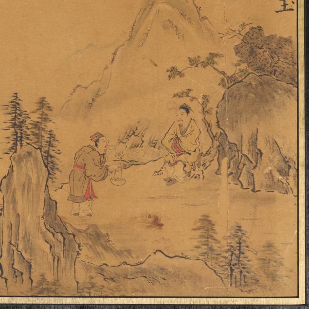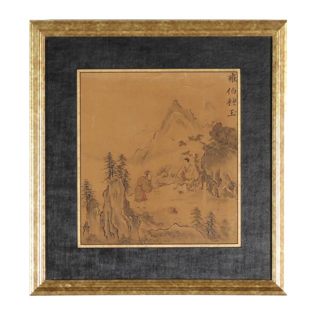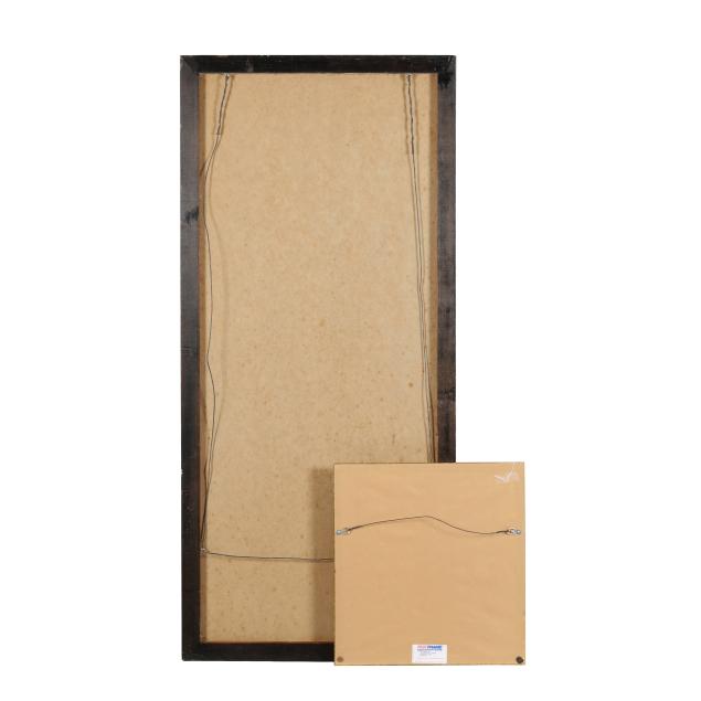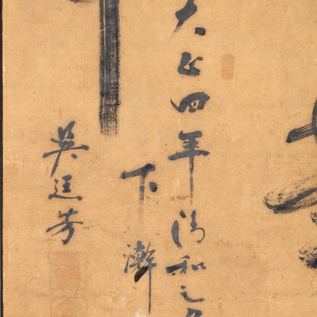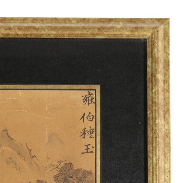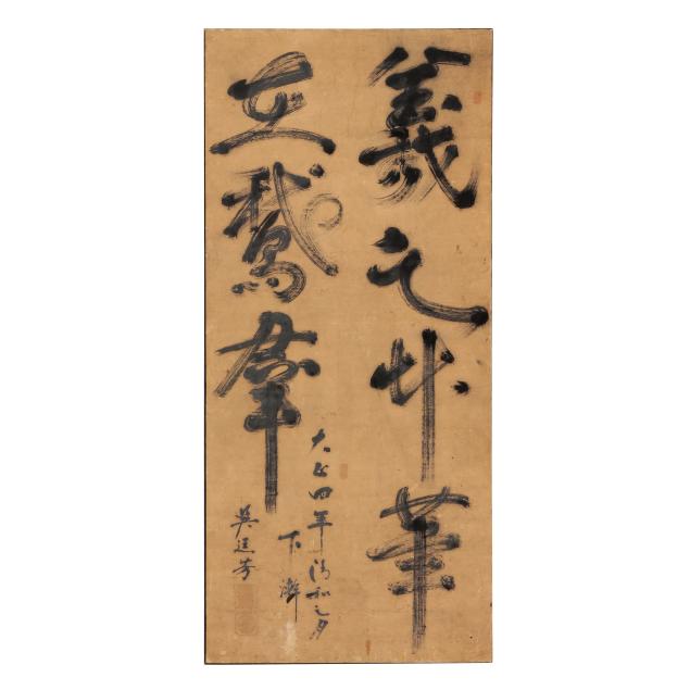 Includes a calligraphy painting, ink on paper, inscribed with date and artist signature to lower left corner together with red artist seals, mounted on board (52 1/2 x 24 x 1 in.)(no cover; toning to paper; scattered stains and discoloration to surface; areas of loss; fading to red ink on seals), and a landscape painting, ink and colors on paper, signed to upper right corner, framed with double mats under glass in a gilt wood frame (18 x 16 1/2 x 1 in.)(tears to paper with some losses; toning to paper; painting not examined outside of the frame).