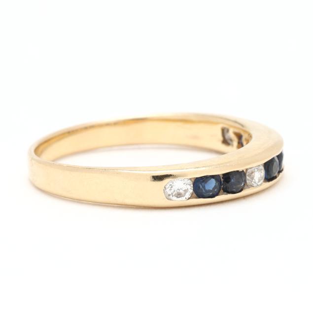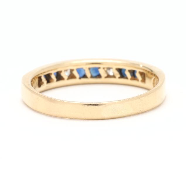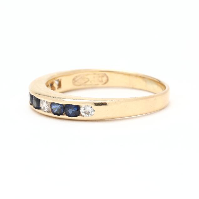 The gold band channel set with round cut sapphires (2.5mm) and full cut round diamond melee, stamped 14KT and with a maker's mark.
