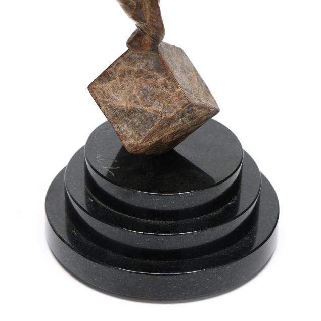 The dancing form of Viktor Kee, composed within a tight baroque spiral, powerfully suggests the force of energy that propels this performer across the stage. Like a dancing flame, elusive and ephemeral, Leap of Faith breaks the bonds of gravity, and seems to twist and spring before our eyes. With a lightness that defies the substance of the bronze, the sculptor has given this figure a powerful athleticism, tempered by grace and wit. The blind-fold reminds us that Viktor's feats take courage and tremendous self-confidence: he is the embodiment of the power of faith in action. Balancing on a cube, we see that his will creates a second by second triumph over gravity - Leap of Faith is the very essence of "living in the moment."