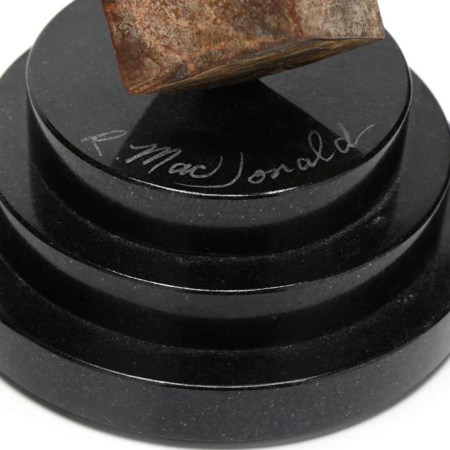 "RM," mounted upon a stepped polished stone swivel base with additional etched signature.