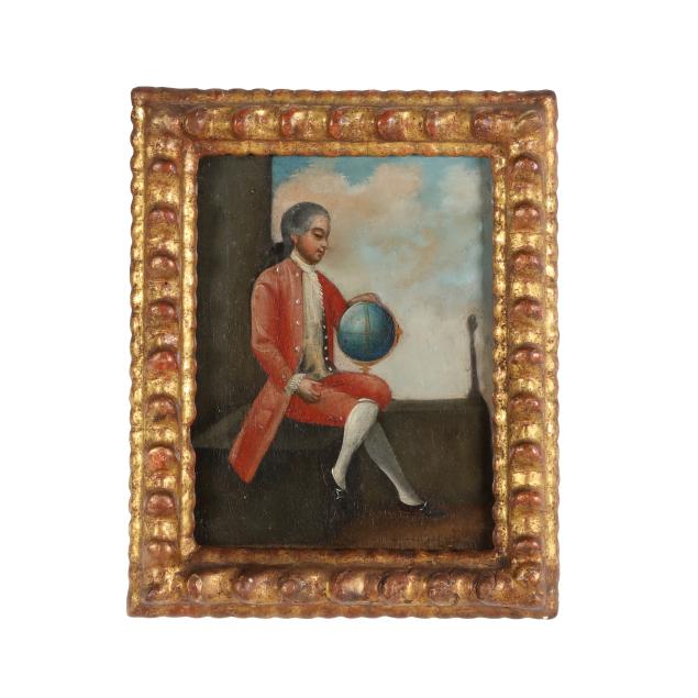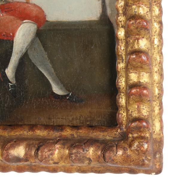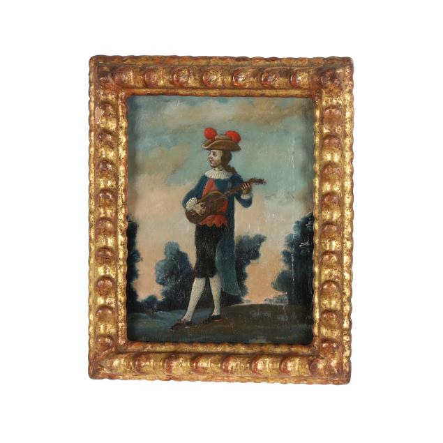 Oil on canvas, unsigned, the first depicting a musician in a landscape playing an early guitar or vihuela, the second depicting an explorer or cartographer contemplating a globe with the sky visible beyond, presented in antique gilt frames.
