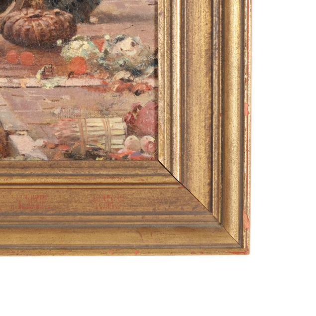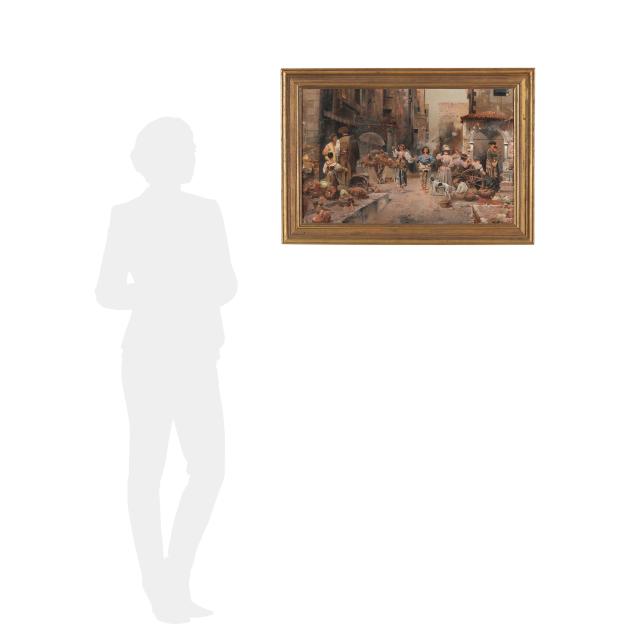 This painting, likely depicting a market scene in Naples, recalls works by artists such as Vincenzo Caprile, Oscar Ricciardi, Cesare Detti, and Pietro Scoppetta.