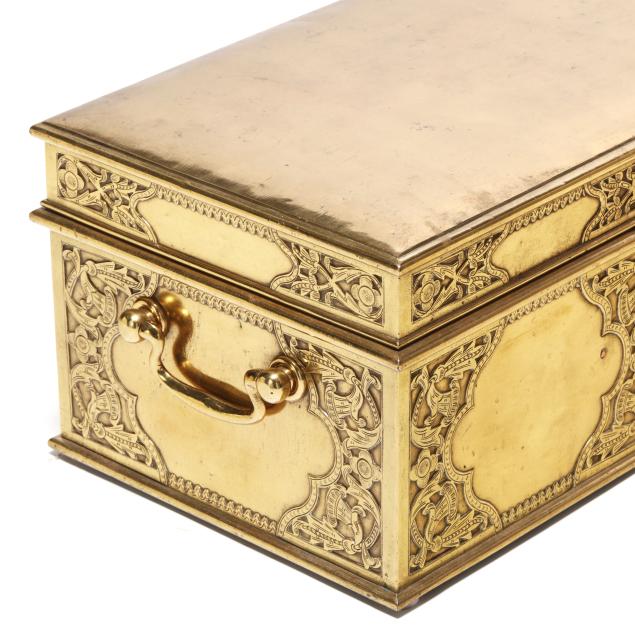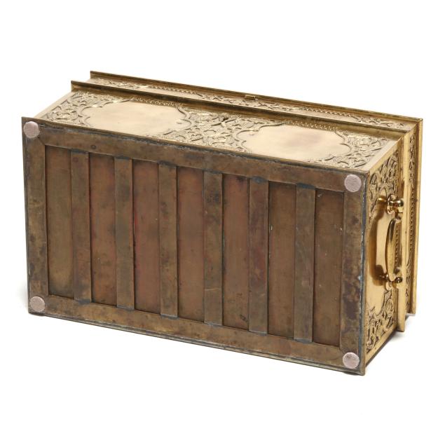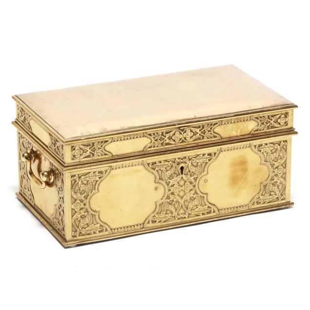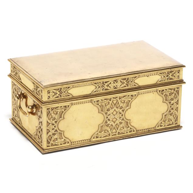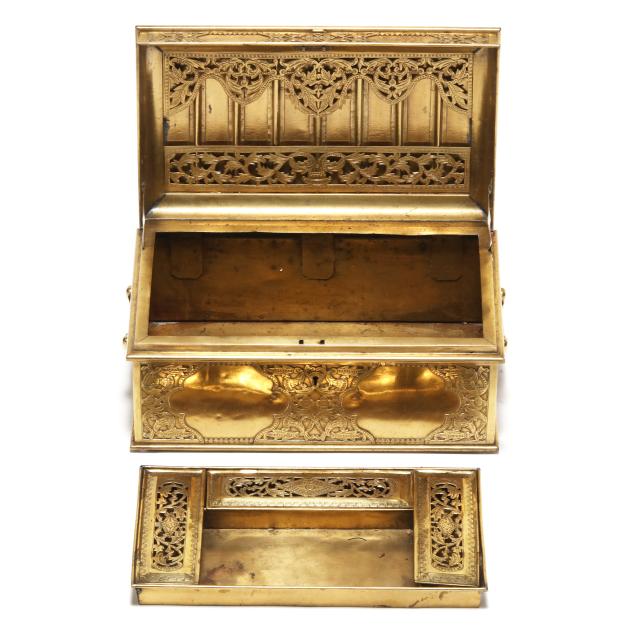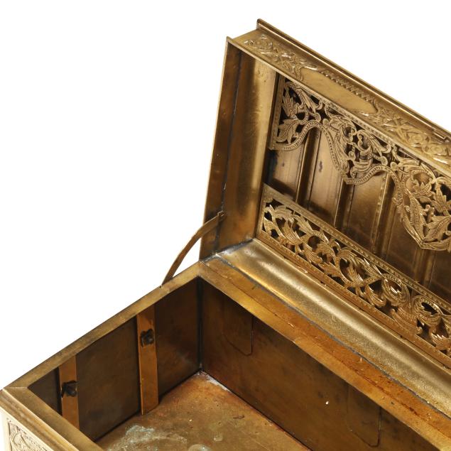 Early 20th century, either Chinese or Southeast Asian, cover and sides with low relief decoration of scrolling vines and floral blooms, hinged lid with handle at top opens to a tray framed with three mounted reticulated rectangular boxes, the tray lifts out, below is open space for storage, keyhole to front side, includes key.