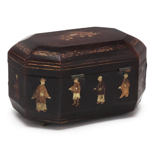 Mid to late 19th century, the octagonal box with paneled side and hinged cover is painted with scenes of figures playing games, raised on four ball feet, with the original engraved white metal canisters with interior lids and decorative covers intact.