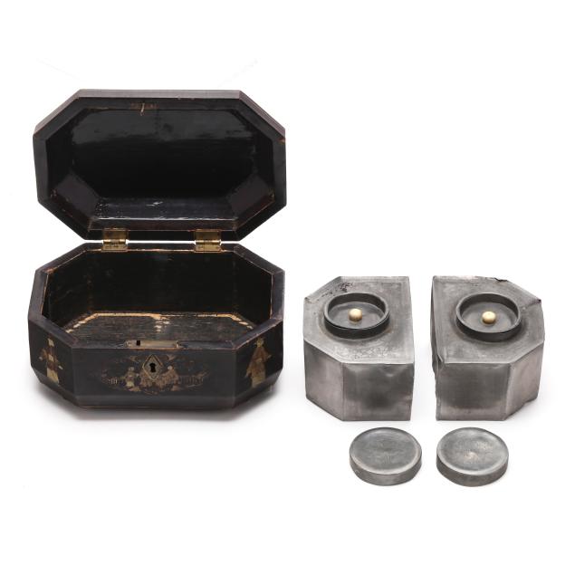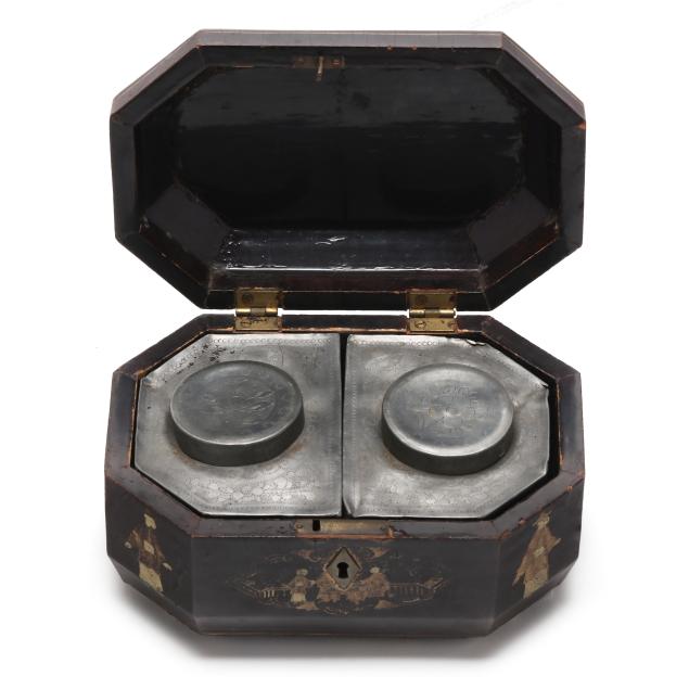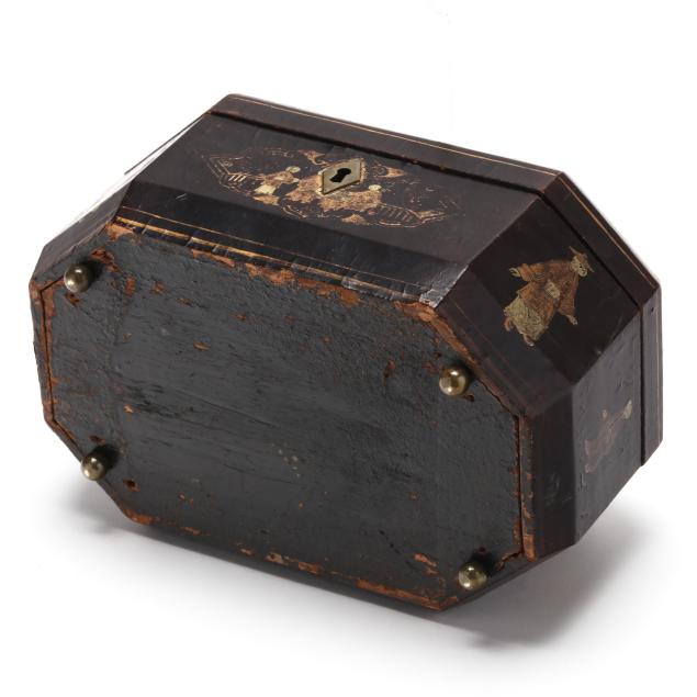 Some denting to tin inserts; scattered scuffs and nicks to lacquer; overall gilt and paint rubbing; missing key.