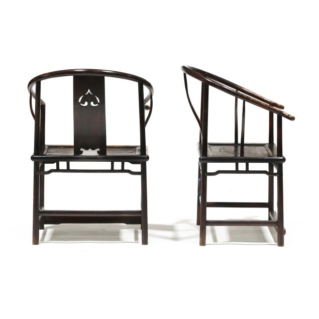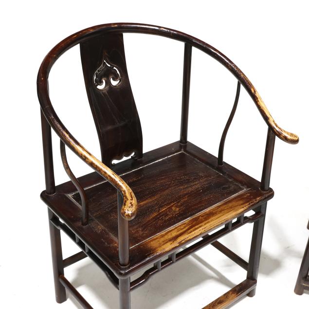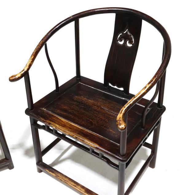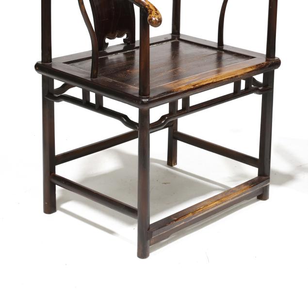 Second half 20th century, mixed woods with dark wash, curved and pierced carved back splat, wide paneled seat, fretwork skirt, rounded straight legs, stretcher base with foot rail.