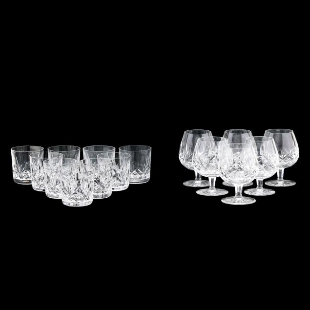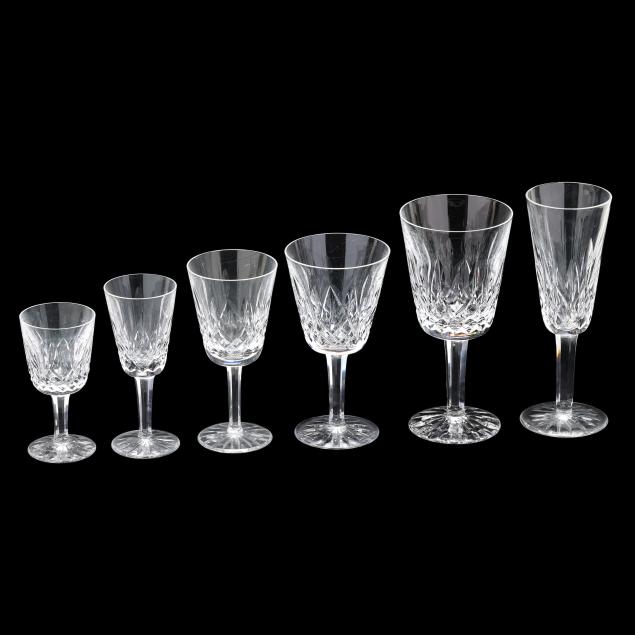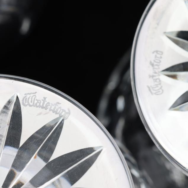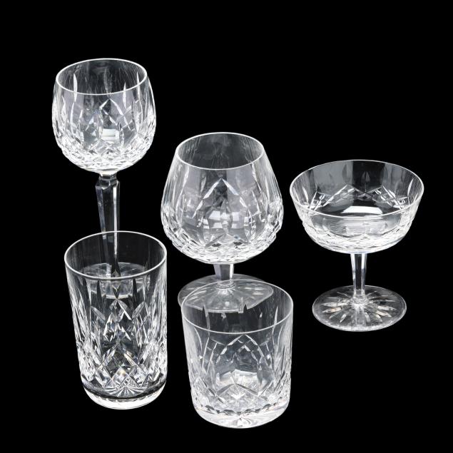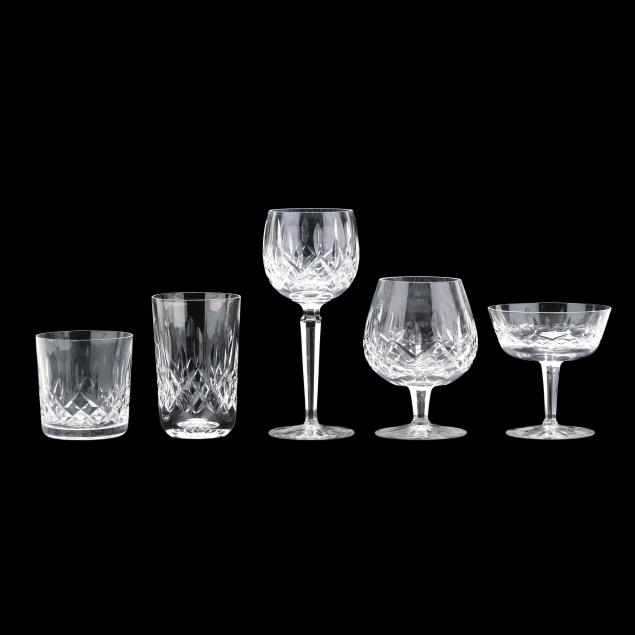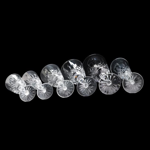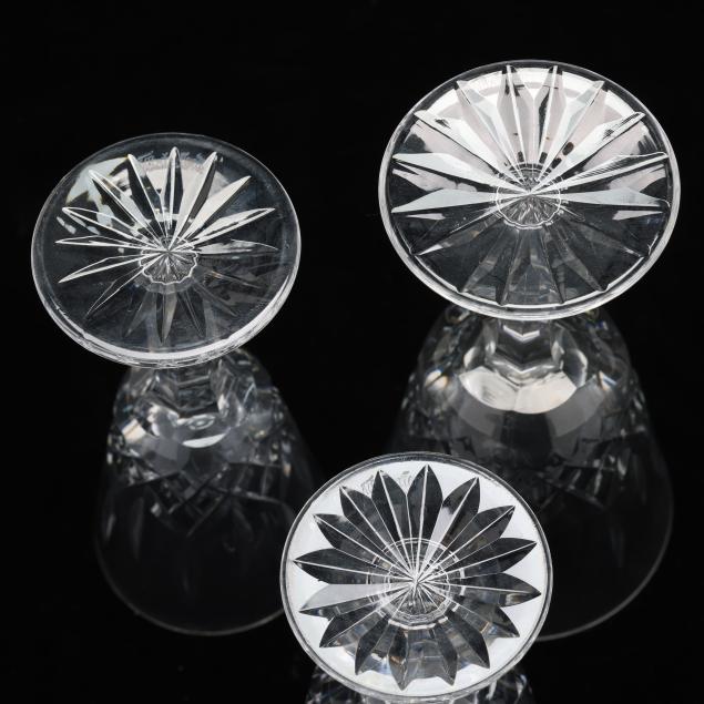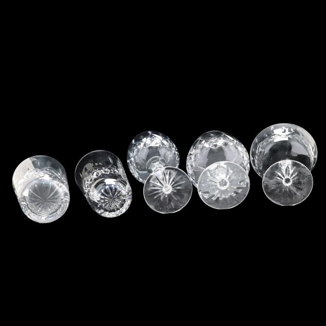 Ireland, mid- to late 20th century, including (11) red wines (6 in.); (11) white wines (5.5 in.); (13) water goblets (7 in.); (5) champagne flutes (7.25 in.); (9) wine hocks (7.5 in.); (6) brandy snifters (5 in.); (9) old fashioneds (3.25 in.); (6) tumblers (4 5/8 in.); (8) cordials (5 in.); and (4) sherry stems (4.25 in.), (12) champagne coupes (4 1/8 in.), signed.