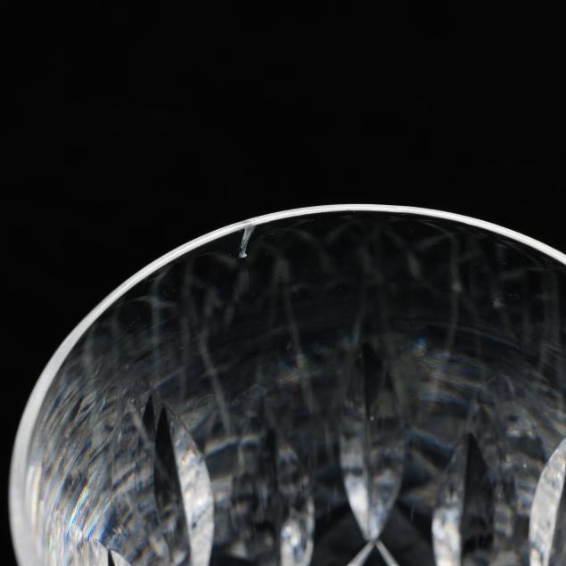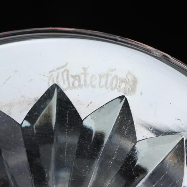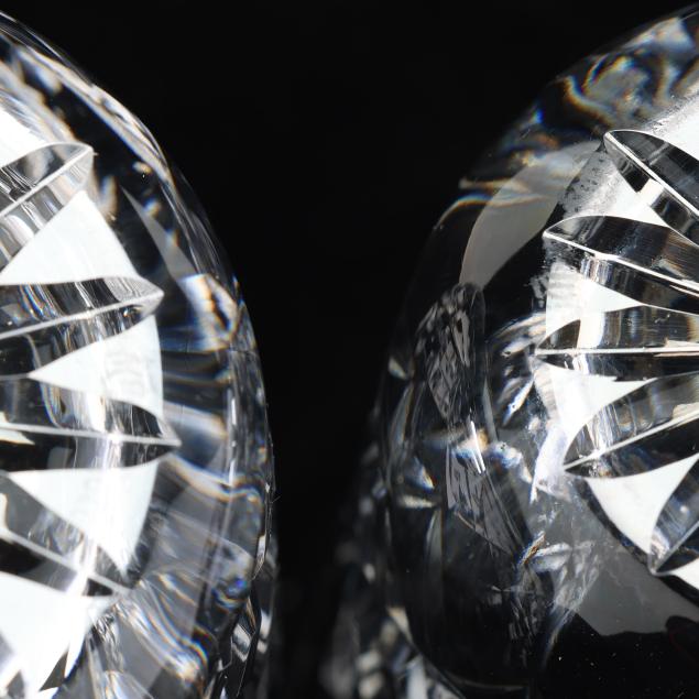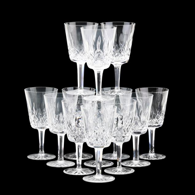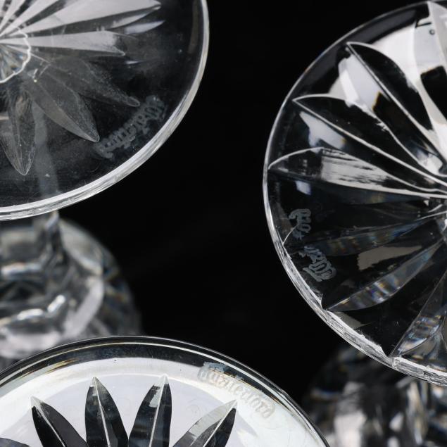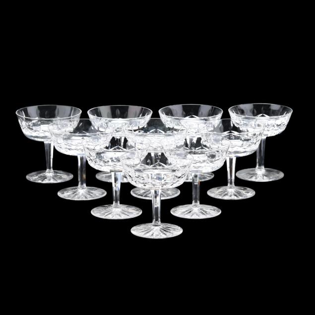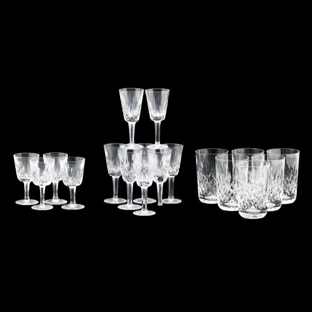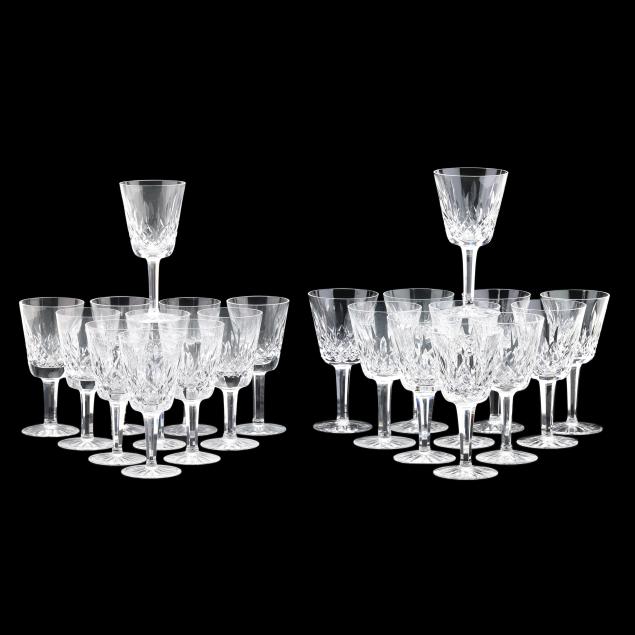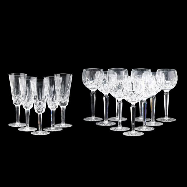 Ireland, mid- to late 20th century, including (11) red wines (6 in.); (11) white wines (5.5 in.); (13) water goblets (7 in.); (5) champagne flutes (7.25 in.); (9) wine hocks (7.5 in.); (6) brandy snifters (5 in.); (9) old fashioneds (3.25 in.); (6) tumblers (4 5/8 in.); (8) cordials (5 in.); and (4) sherry stems (4.25 in.), (12) champagne coupes (4 1/8 in.), signed.