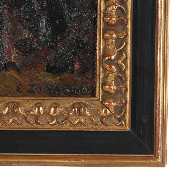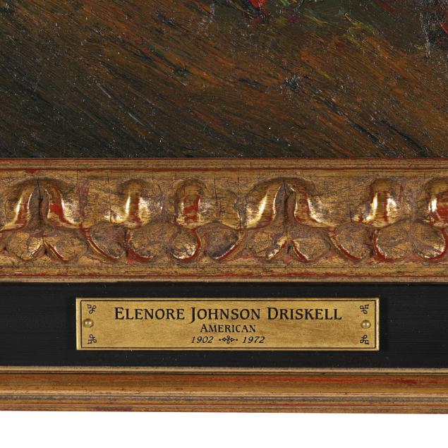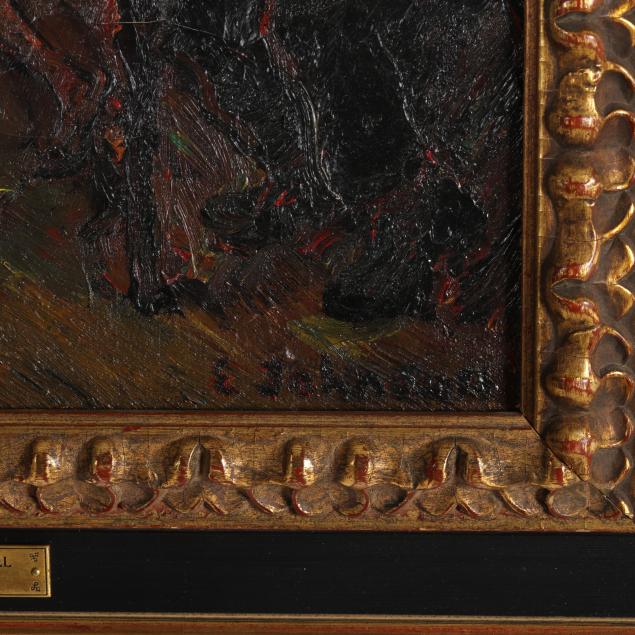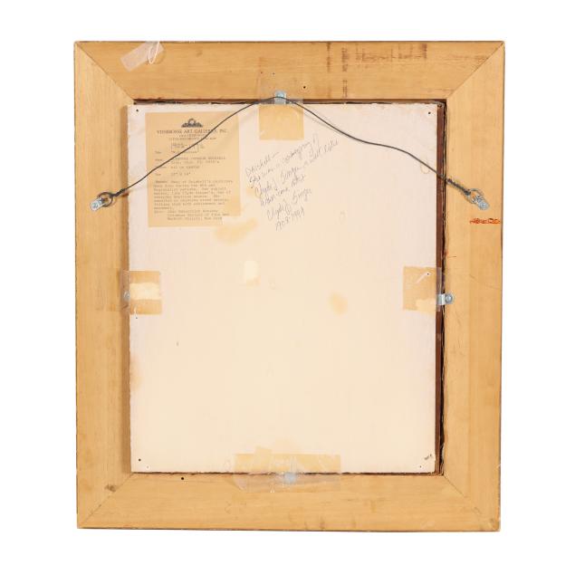 Oil on canvas, signed at lower right, retaining gallery label to verso, presented in an ebonized frame with nameplate affixed at lower center.