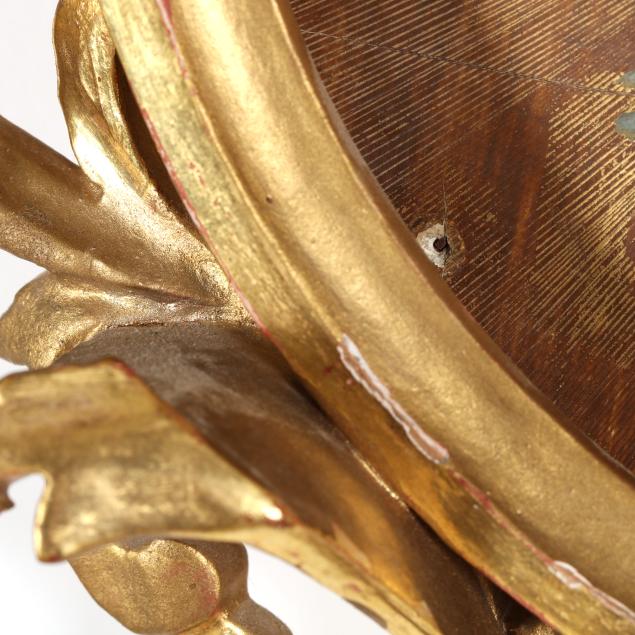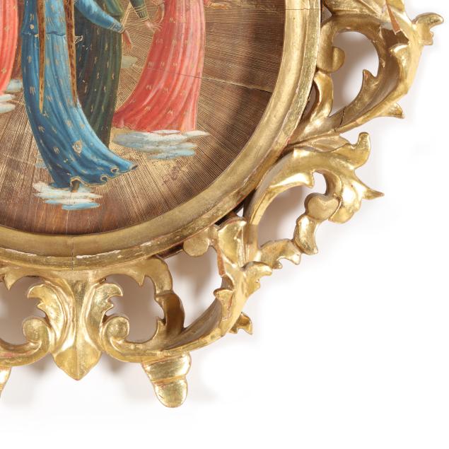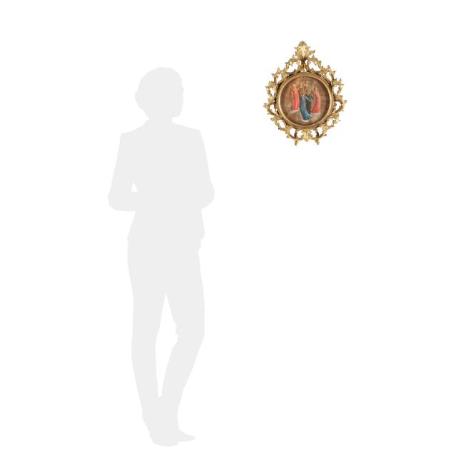 Tempura and gilt paint on panel with incising, 19th century, presented in a Florentine giltwood frame.