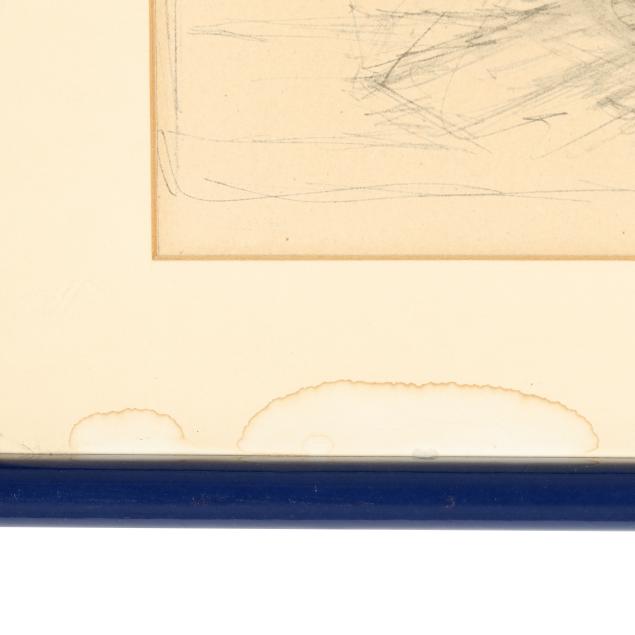 Offset lithographic print, after a 1954 drawing, printed signature to lower right, matted and framed below Plexiglass.