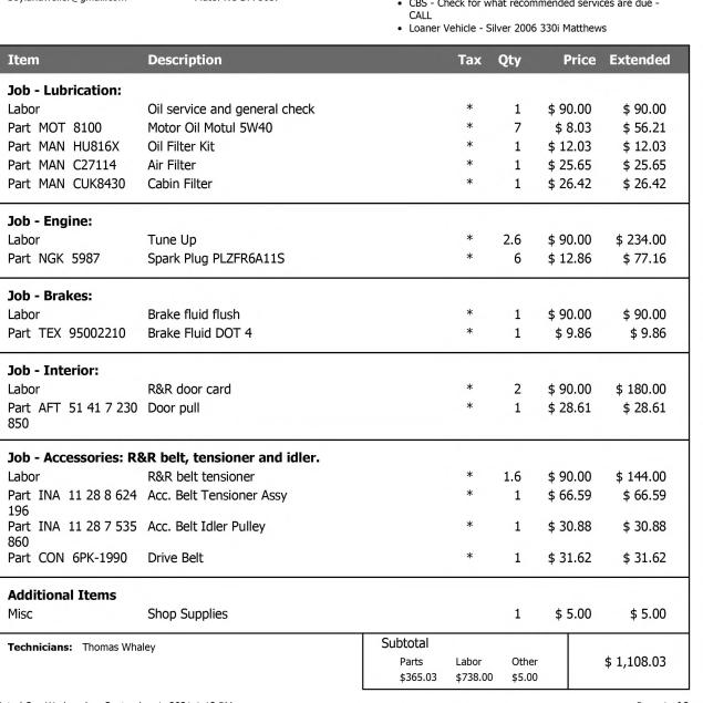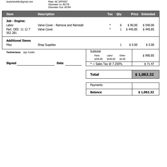 New information available. Owner states that since ownership at 66k miles, A BMW specialist Shadetree garage in Cary, North Carolina serviced the car. All records not readily available, and business closed when owner retired. Many items addressed during ownership to include: oil filter housing gasket, oil pan gasket, valve cover gasket, thermostat, and water pump, Motul 5W40 and Mann filters used for regular oil changes, many suspension parts replaced as needed, and new battery just installed. A few receipts were found to confirm Valve cover gasket in 2018, and stated that OFHG was done about the same time, with the oil pan gasket performed sometime before those. Also, a tune up to confirm belt tensioner and assembly replaced as well as spark plugs.