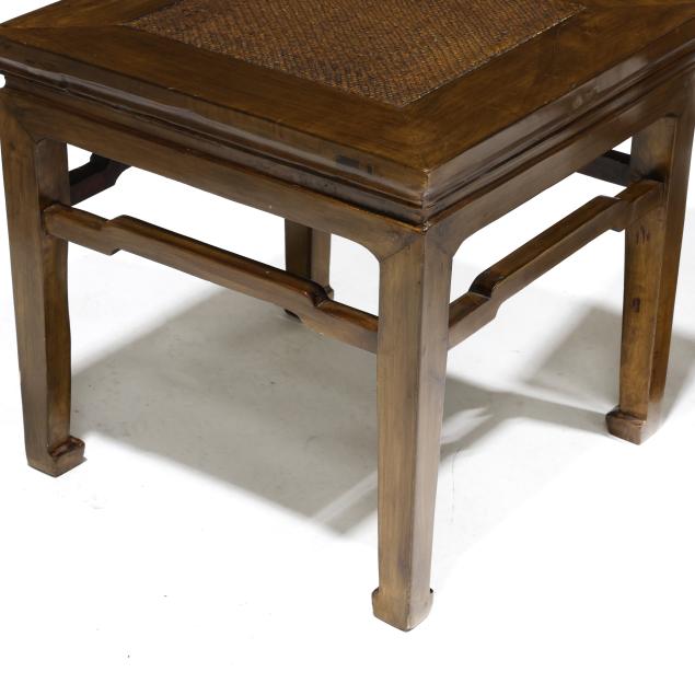 Second half 20th century, flush paneled top with central woven grass panel, molded edge, straight legs with shaped stretcher and stylized whorl feet.