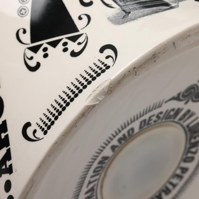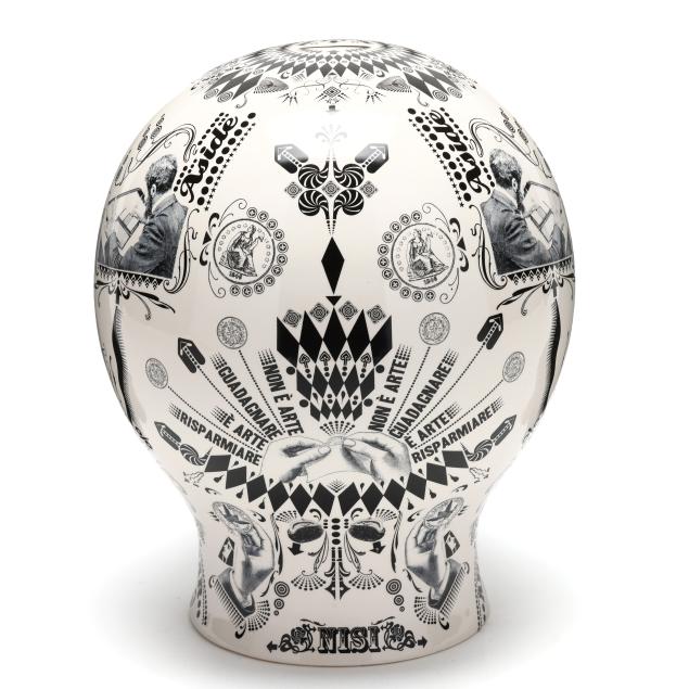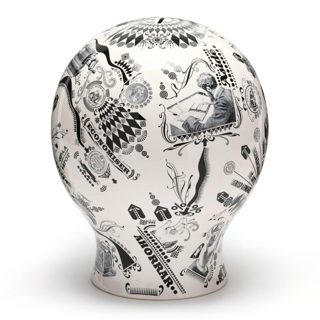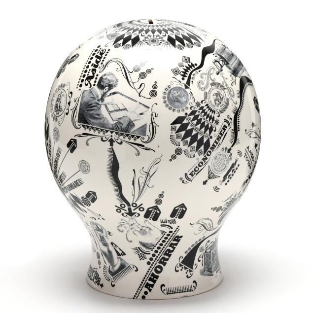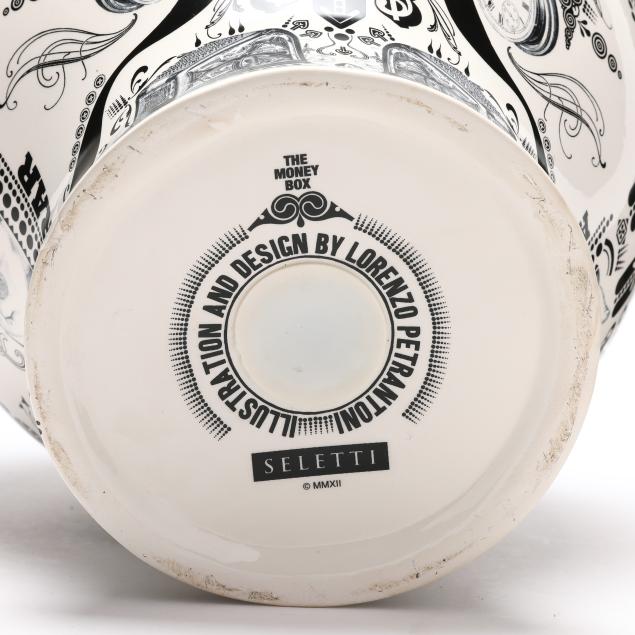 Italy, designed by Lorenzo Petrantoni, transfer decorated ceramic coin bank with coin slot to top and removable plug to underside, labeled to underside.