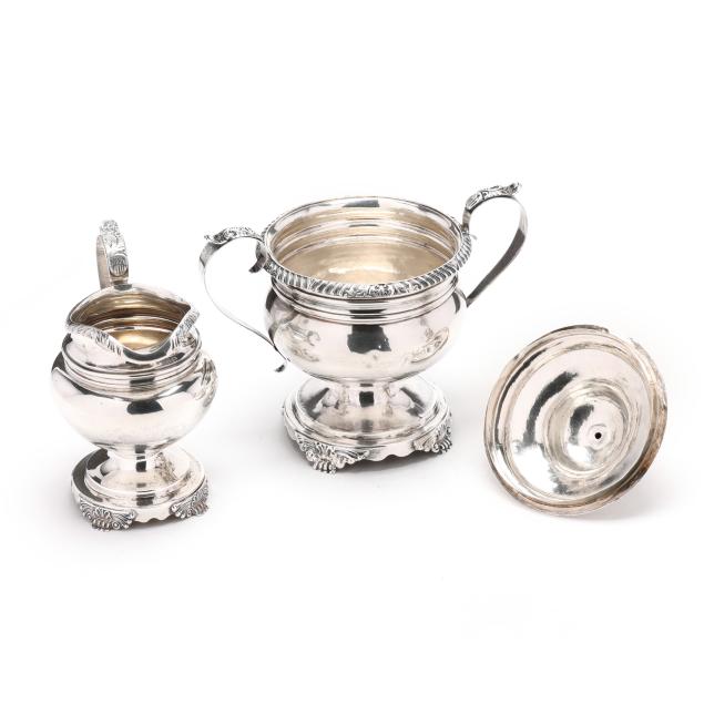 Boston, Massachusetts, circa 1816 to 1825, includes a teapot (9 1/2 x 9 1/2 x 6 in.) and sugar bowl (9 x 9 x 5 1/2 in.); and a later creamer in the same pattern, mark of Baltimore Schofield (6 1/2 x 5 1/2 x 5 in.); each featuring a foliate gadrooned rim, raised on a pedestal base, with classical style feet, not monogrammed.