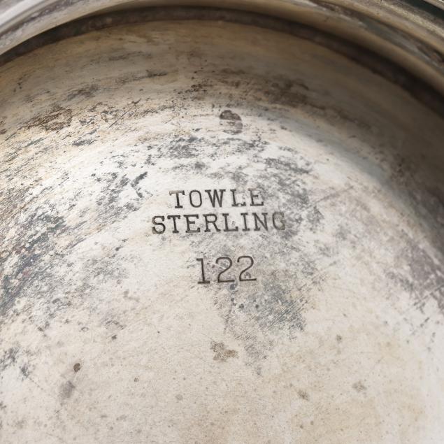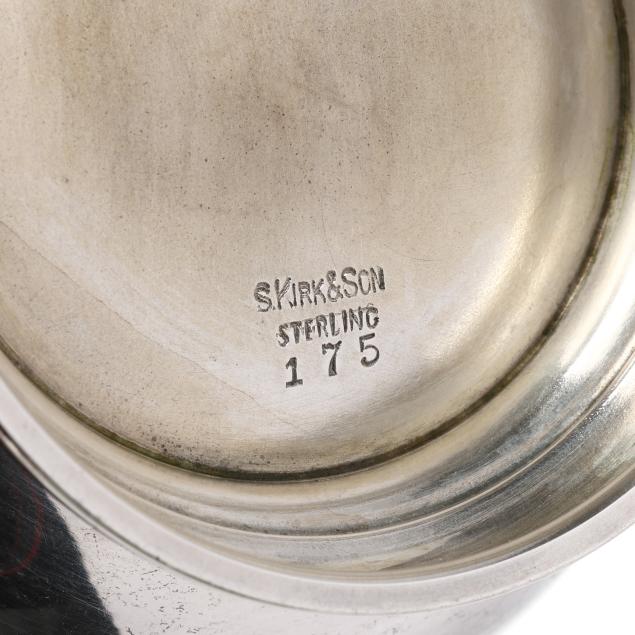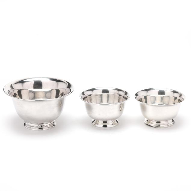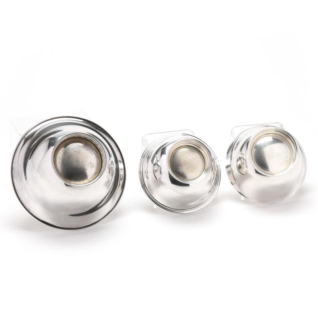 The largest, mark of Towle, pattern number 122 (3 1/4 x 6 in. dia.); one with mark of S. Kirk & Son, pattern number 175 (2 1/2 x 4 3/8 in. dia.); and one with mark of Manchester Silver Co., pattern number 873 (2 1/4 x 4 1/2 in. dia.); none monogrammed.