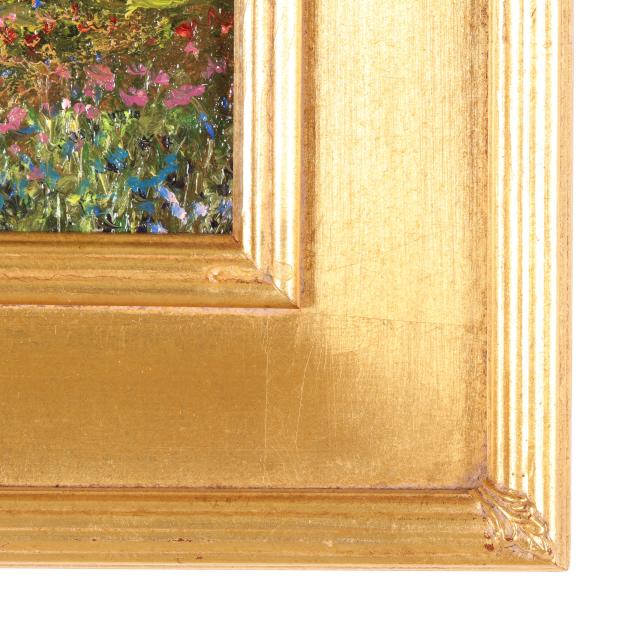 Oil on board, signed at lower left, inscribed to the verso, presented in a gilt plein air style frame.