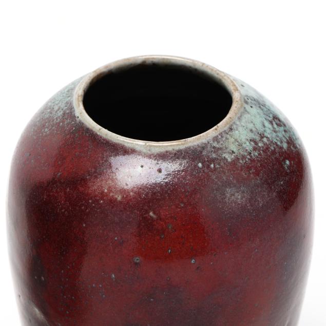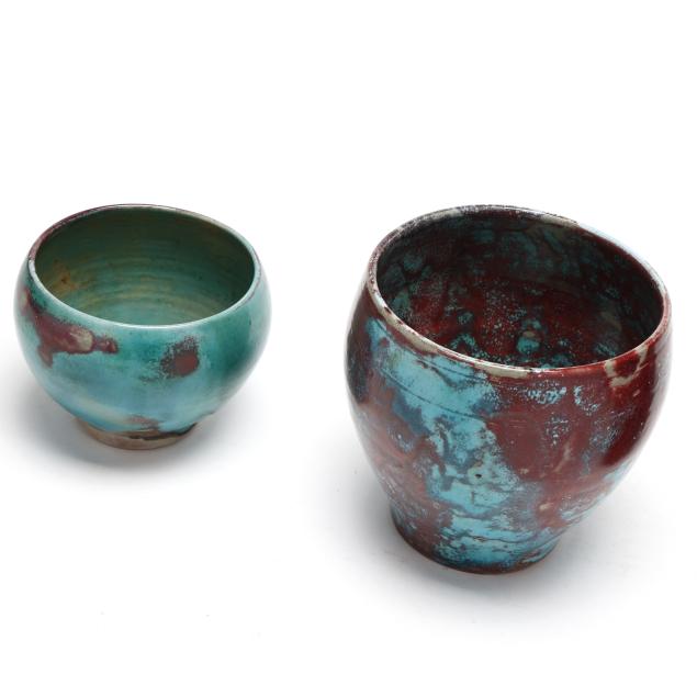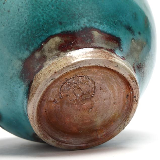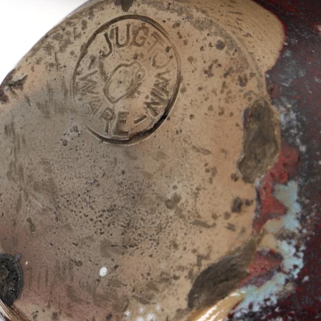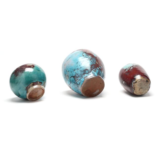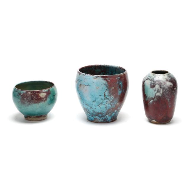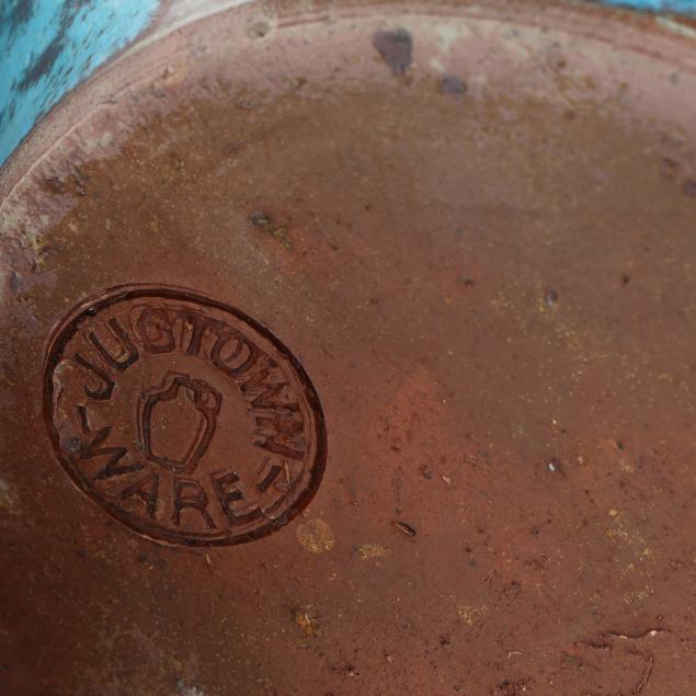 1930s-1950s, including a small egg vase (6 3/4 x 4 1/2 x 4 1/2 in.); a footed jardiniere with banded rim (6 3/4 x 7 x 7 in.); and a footed bowl (4 5/8 x 6 x 6 in.), all marked with Jugtown Ware stamp to underside.