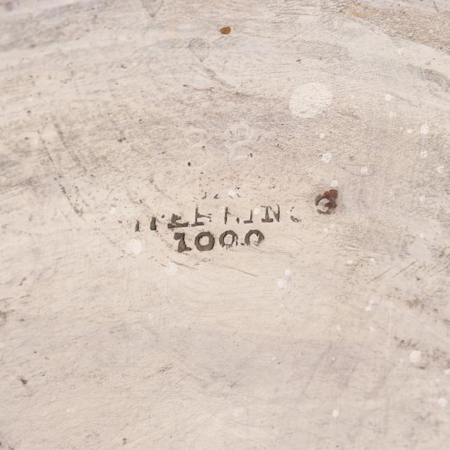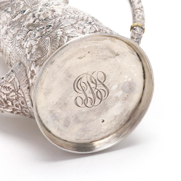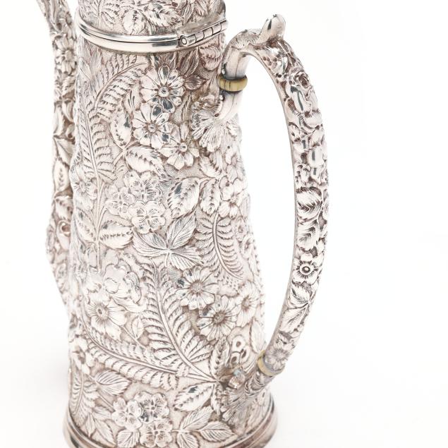 Partially rubbed maker's marks, featuring a foliate finial, over a highly decorated body with hand-chased floral and leaf motifs in high relief against a stippled ground, monogrammed to the underside.
