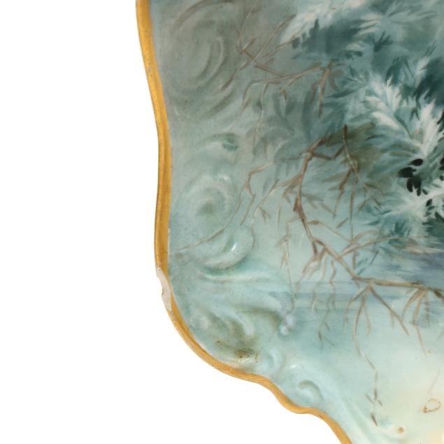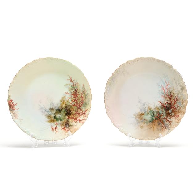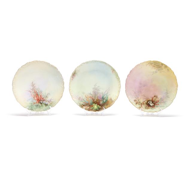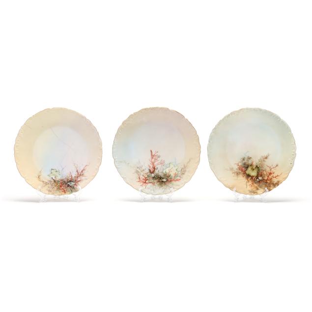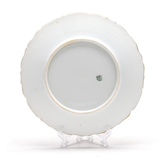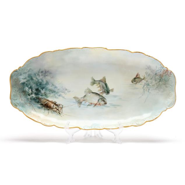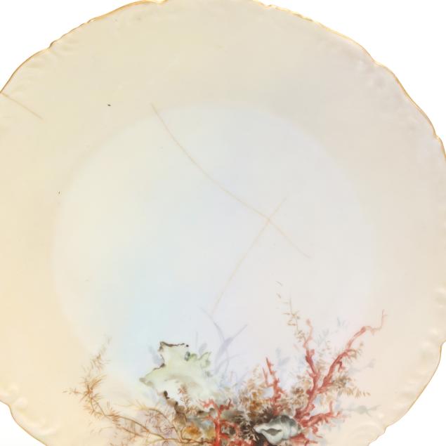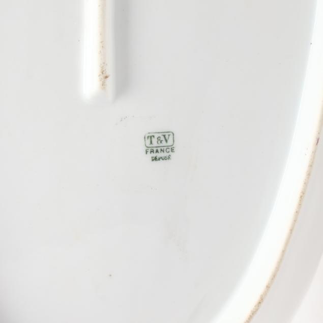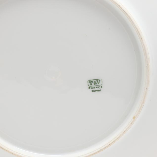 France, circa 1900, (19) hand-painted porcelain pieces with gilt scalloped rims to include (1) large oval platter with fish and a lobster (20 5/8 x 10 3/8 x 2 1/4 in.); and (11) dinner plates variously decorated with shells and coral reefs (9 3/8 in. diameter), all marked "T&V / France / Depose" in green to underside.
