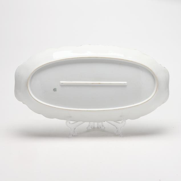 Gilt rubbing to all; chip to handle of one platter; several hairlines to one plate; several plates with light staining and small surface marks.