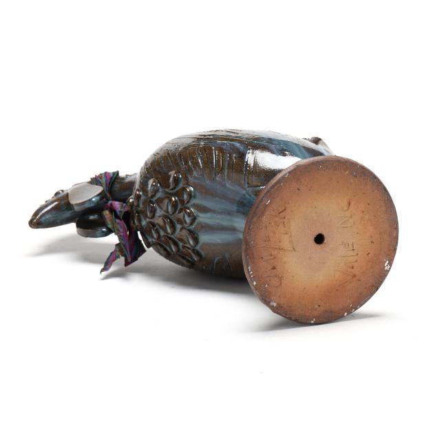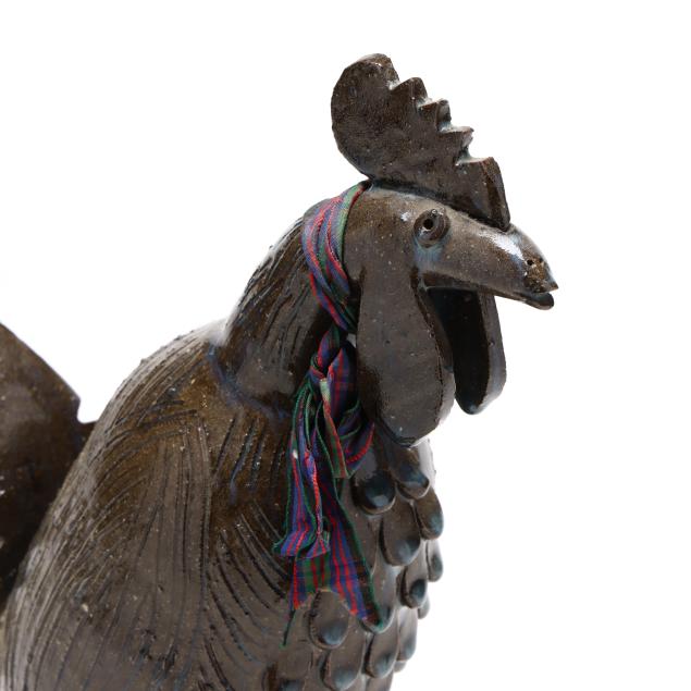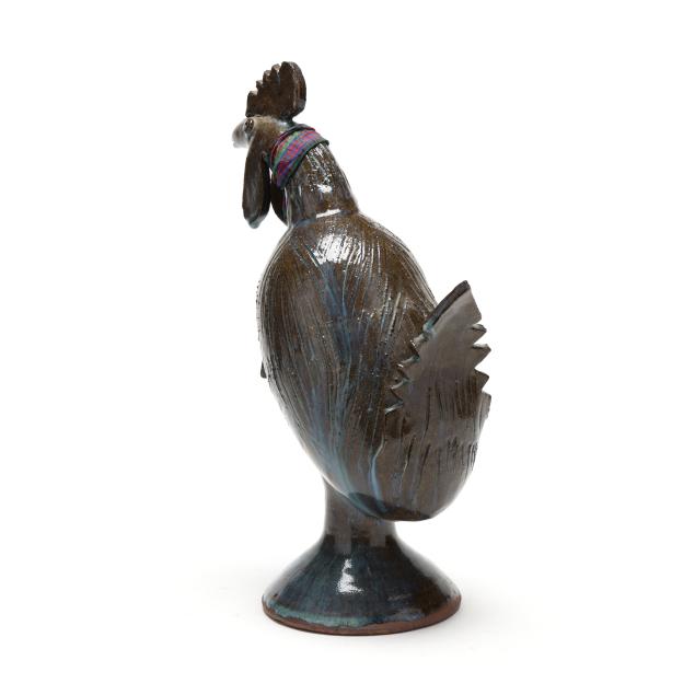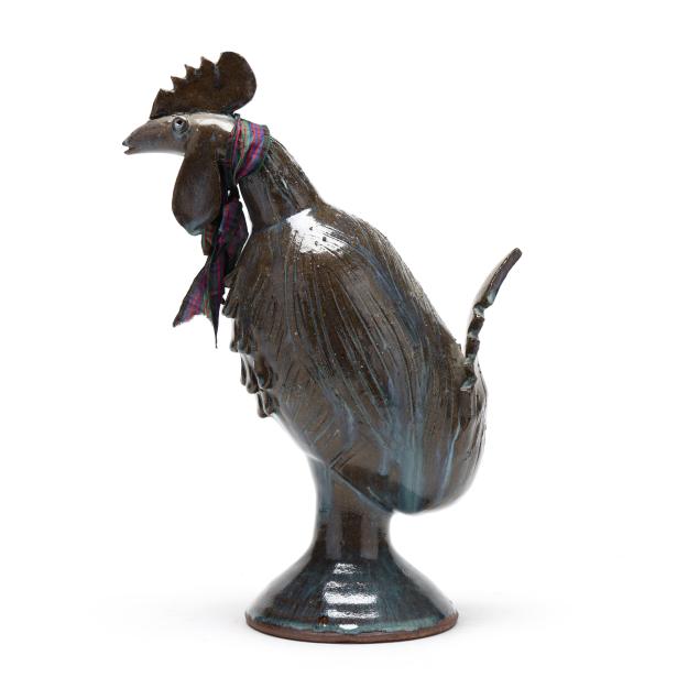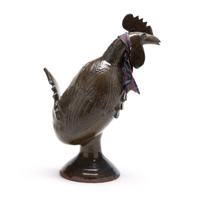 Late 20th century, brown glazed earthenware rooster with incised details and blue glaze drip accents, signed to underside, with decorative cloth scarf wrapping neck.