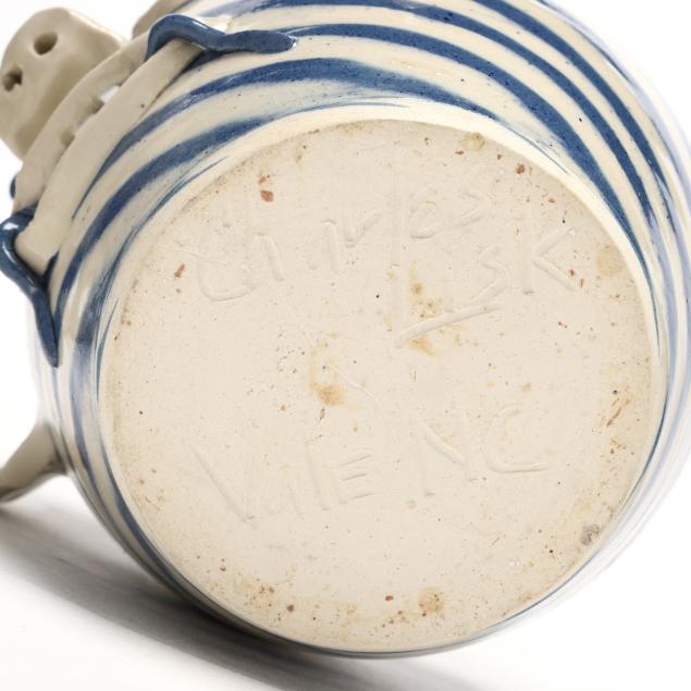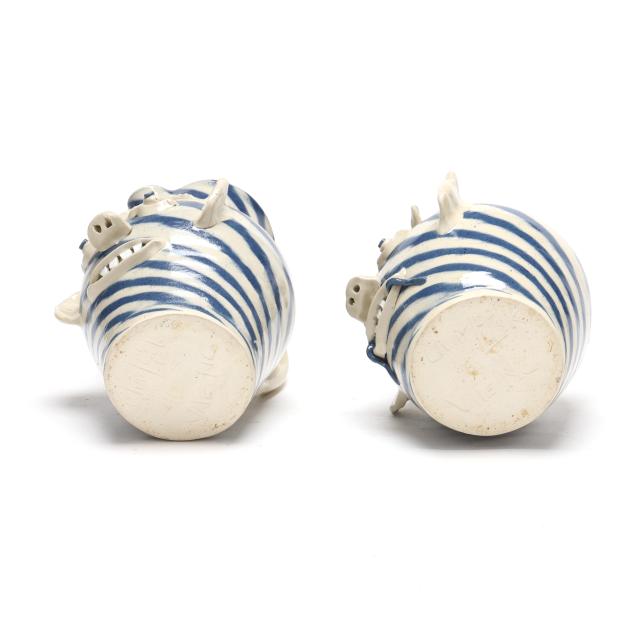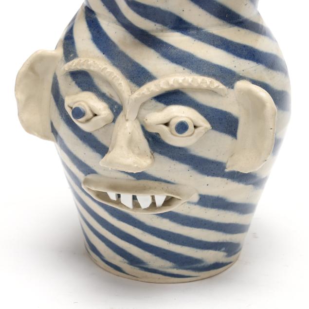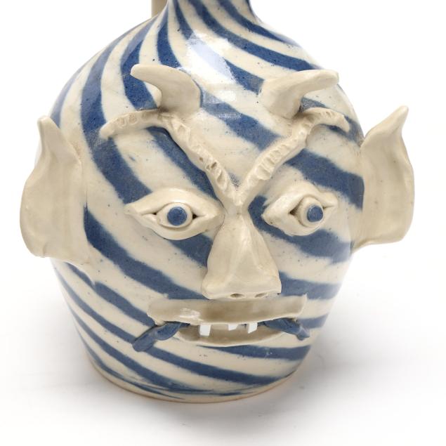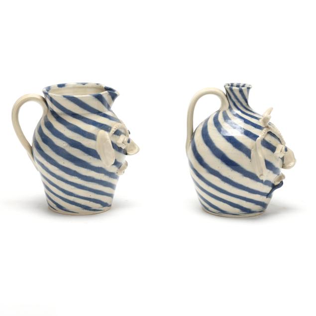 Late 20th century, both with white and blue swirl glaze, applied features and handles, and porcelain shard teeth, the first a pitcher (7 5/8 x 6 1/2 x 8 1/2 in.), the second a jug (8 x 7 x 7 in.), both signed to underside.