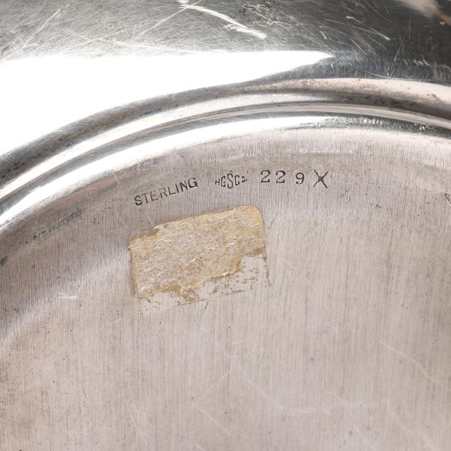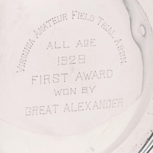 Mark of HGSCo., pattern number 229X, with a repousse rim and classical decoration to the flared flange, the center engraved "Virginia Amateur Field Trial Assn. / All Age / 1929 / Fist Award / Won By / Great Alexander".