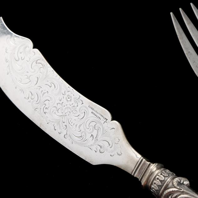 Includes a knife (13 in.) and fork (10 3/8 in.), with fish scale and scrolled decoration to the handles; the blade and tines with ornate engraving, the blade marked "Gorham & Company / Sterling," with period monograms to the handles.