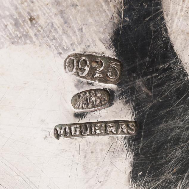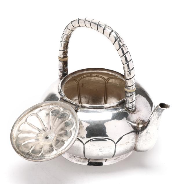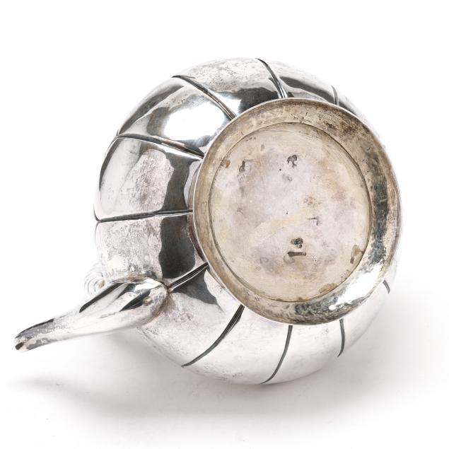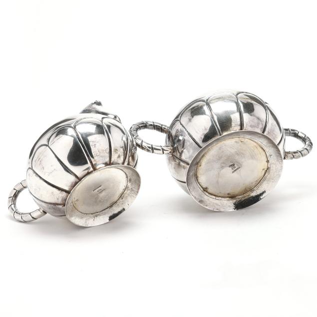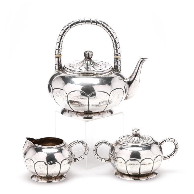 Mark of Vigueras, Mexico City, mid-20th century, the three piece set includes a teapot with set top handle (8 1/2 x 8 1/2 x 7 in.); creamer (3 1/4 x 5 1/2 x 4 1/2 in.); and a covered sugar bowl (4 x. 7 x 4 1/2 in.) each a lobed form with twisted handles, raised on round feet, not monogrammed.