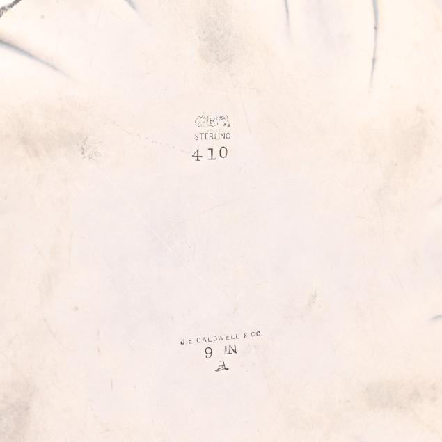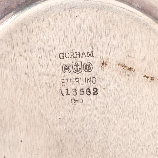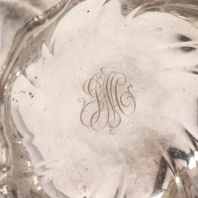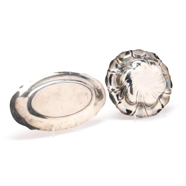 The first, a vegetable bowl, mark of Reed & Barton, pattern number 410, date mark of 1932, retailed by J.E. Caldwell & Co., lobed form with a swirled everted rim, monogrammed (2 1/2 x 9 in. dia.); and a Gorham bread tray, pattern number A13562, date mark of 1932, not monogrammed (7 x 12 1/2 in.).