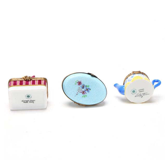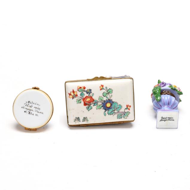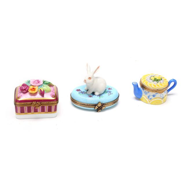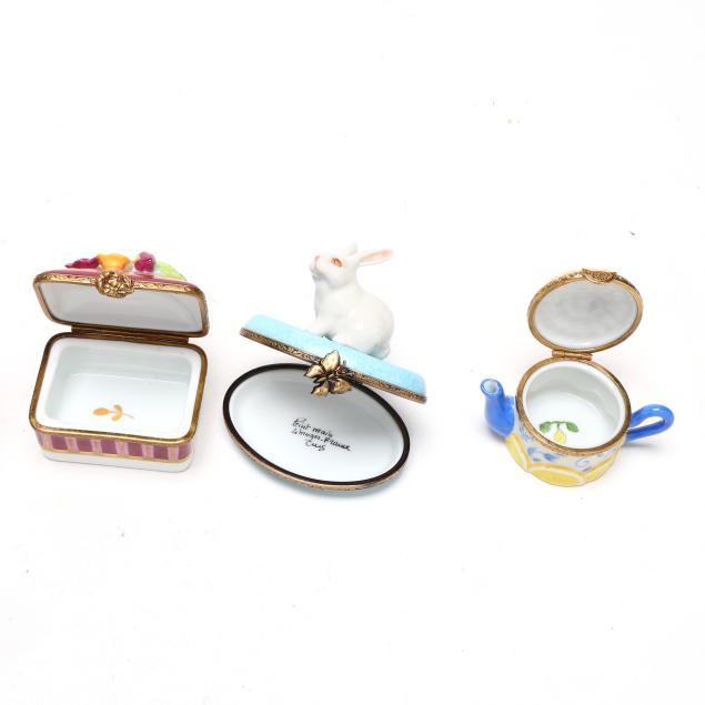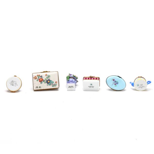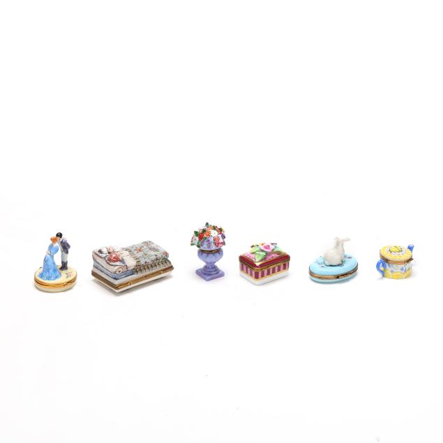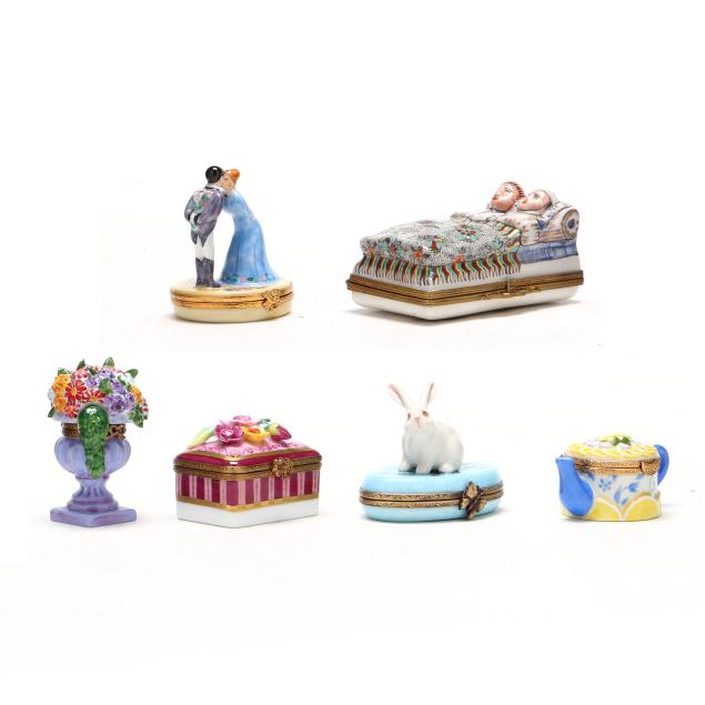 France, hand-painted porcelain hinged boxes, including a late-19th-century Chantilly box of a couple in bed (2 x 3 1/4 x 2 1/4 in.) and (5) mid-to-late-20th-century boxes: a blue oval box with white bunny (2 1/4 x 2 3/4 x 2 in.), a pink present box (2 x 2 1/4 x 1 1/2), a round box with a couple kissing (2 5/8 x 2 in. diameter), a purple urn with a bouquet of flowers (2 3/4 x 1 1/2 in. diameter), and a teapot with lemons (1 3/8 x 2 7/8 x 1 5/8 in.), all but Chantilly box marked to interior or underside.