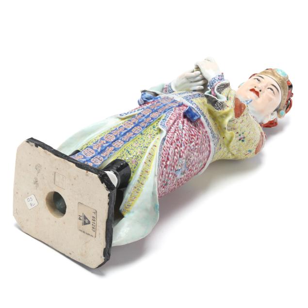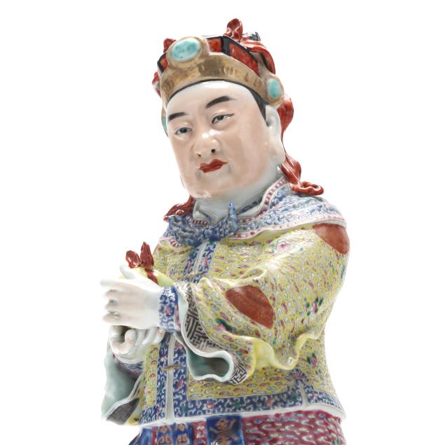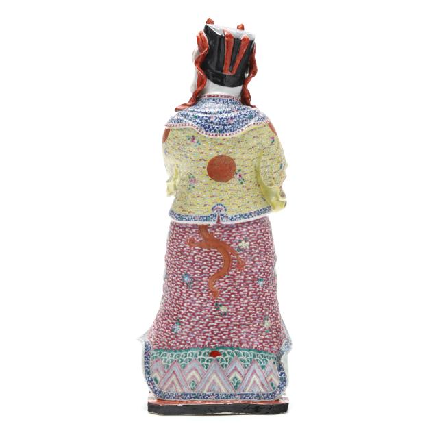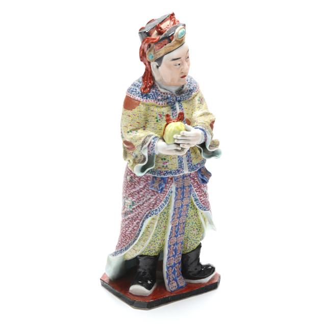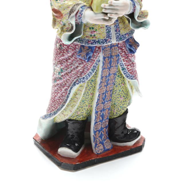 Republic period (1912-1949), a porcelain standing figure hand-painted in vibrant famille rose palette, he holds an item, perhaps a large peach, and wears robes decorated with longevity symbols to the front, with an impressed four character mark to the underside.